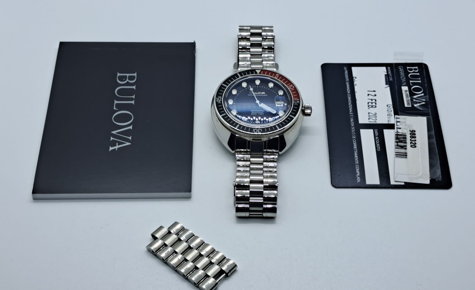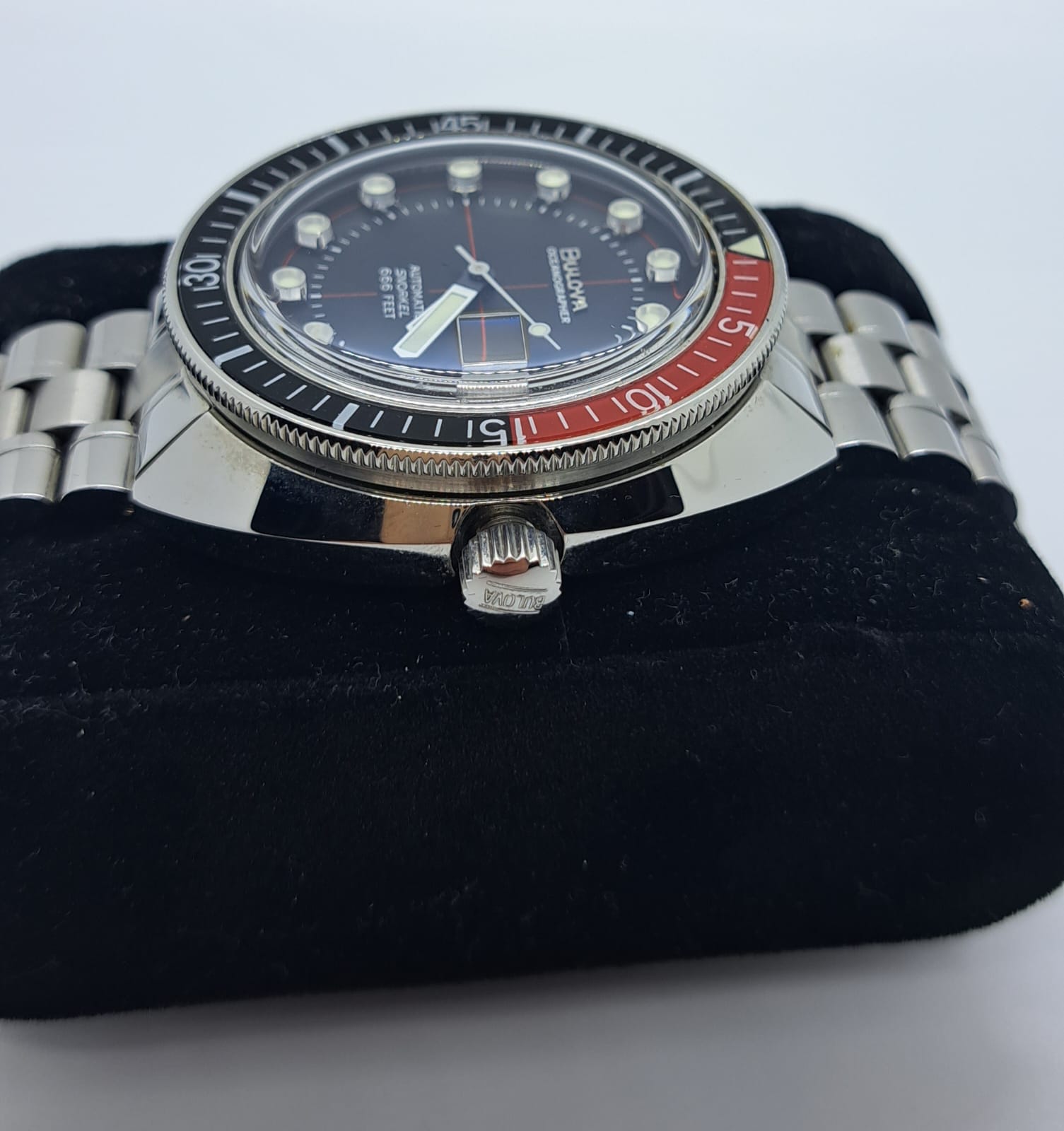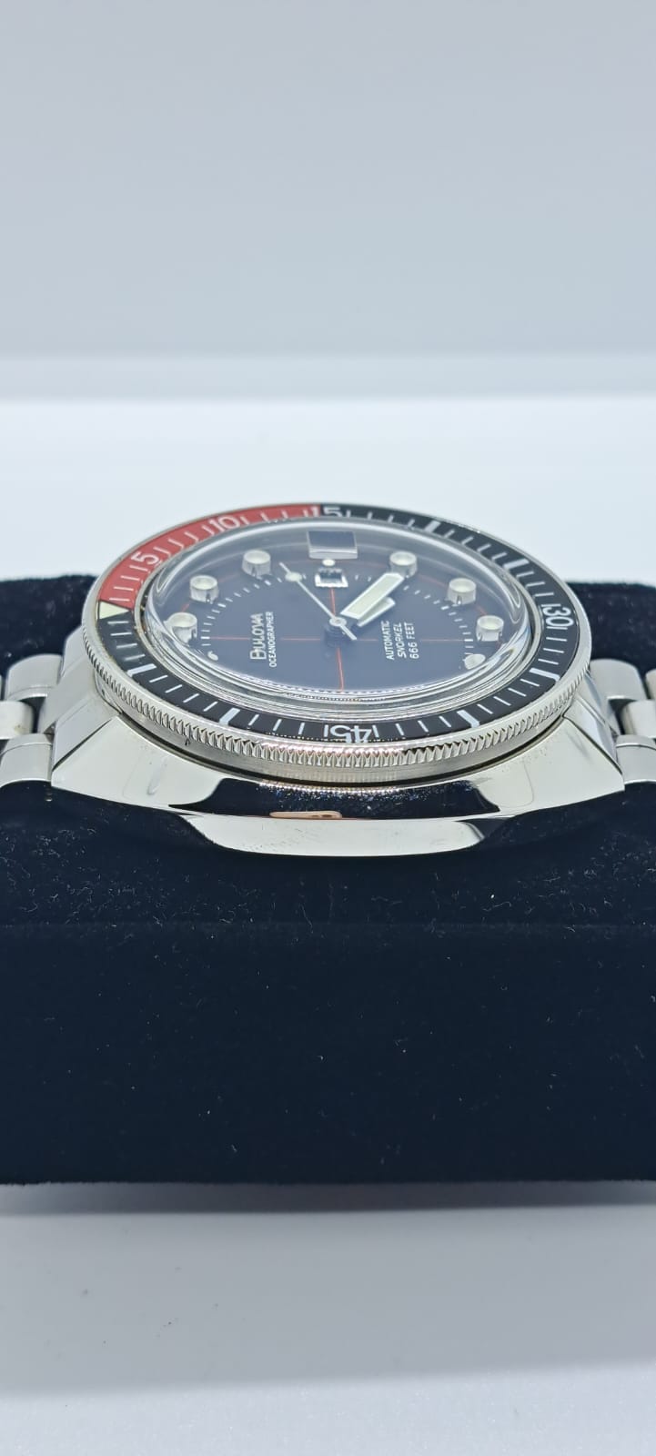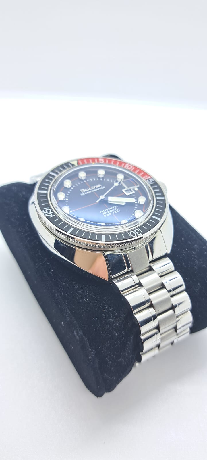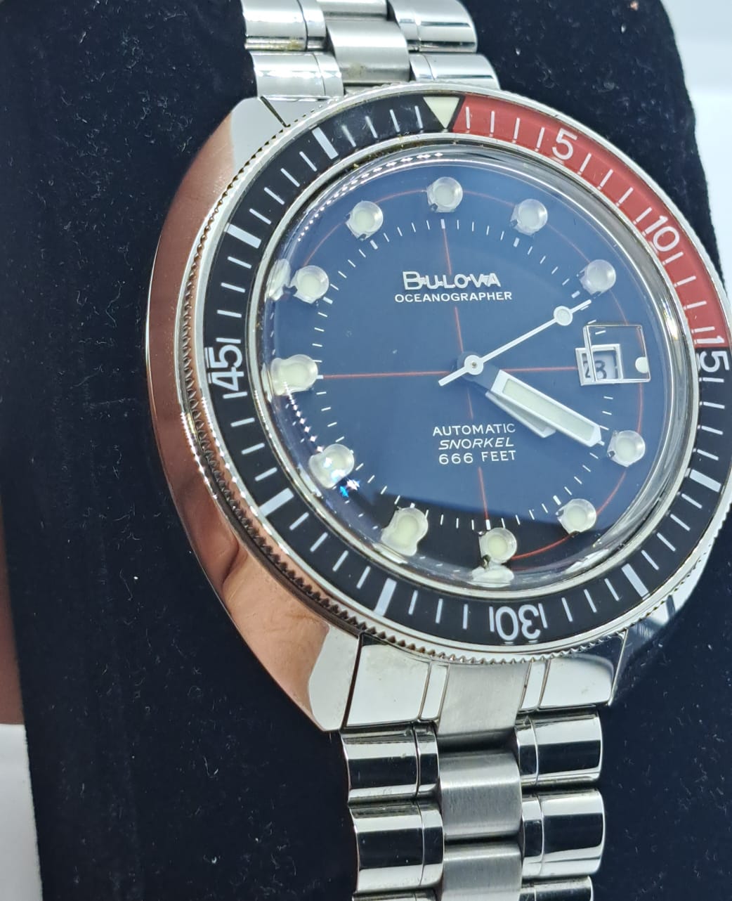 Bulova Oceanographer “Devil Diver”, un’icona che celebra la storia delle immersioni. Questo celebre segnatempo automatico fu introdotto nel mercato 1972. Il modello originale è un segnatempo automatico da immersione, dotato di una ghiera girevole con dettagli in nero e rosso. L’orologio si guadagnò il soprannome di “Devil Diver” quando Bulova indicò sul quadrante del modello originale degli anni ‘70 il valore d’impermeabilità in unità di misura americana “666 feet” invece dei tradizionali 200 metri. Full set. Spedizione tracciata e assicurata