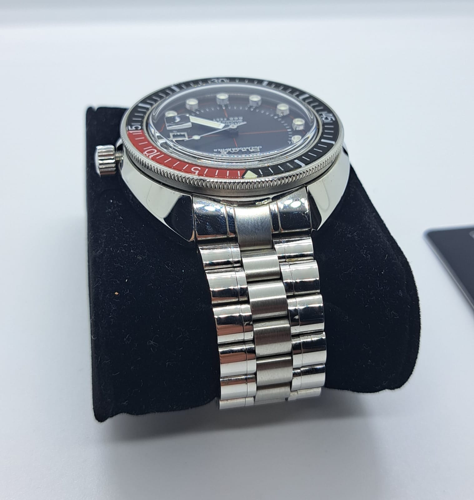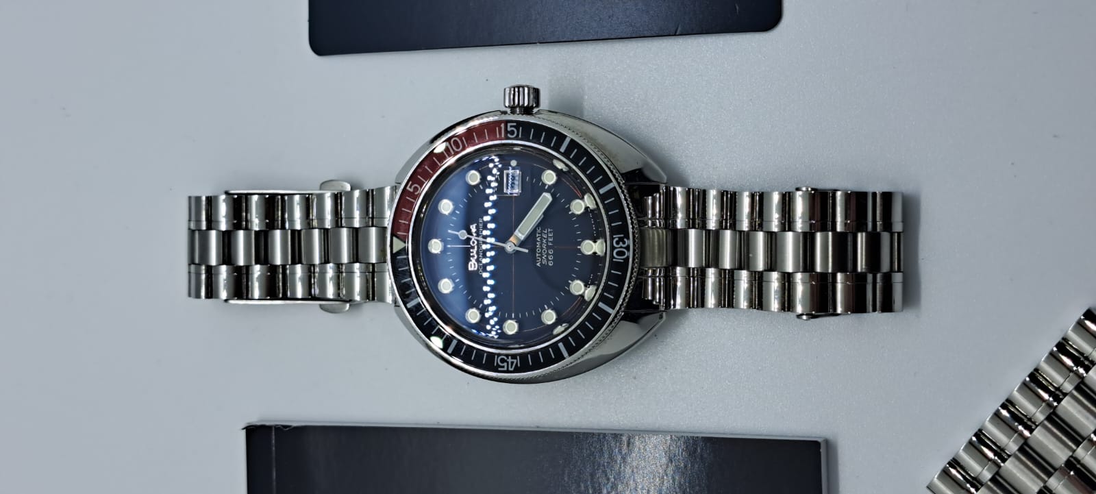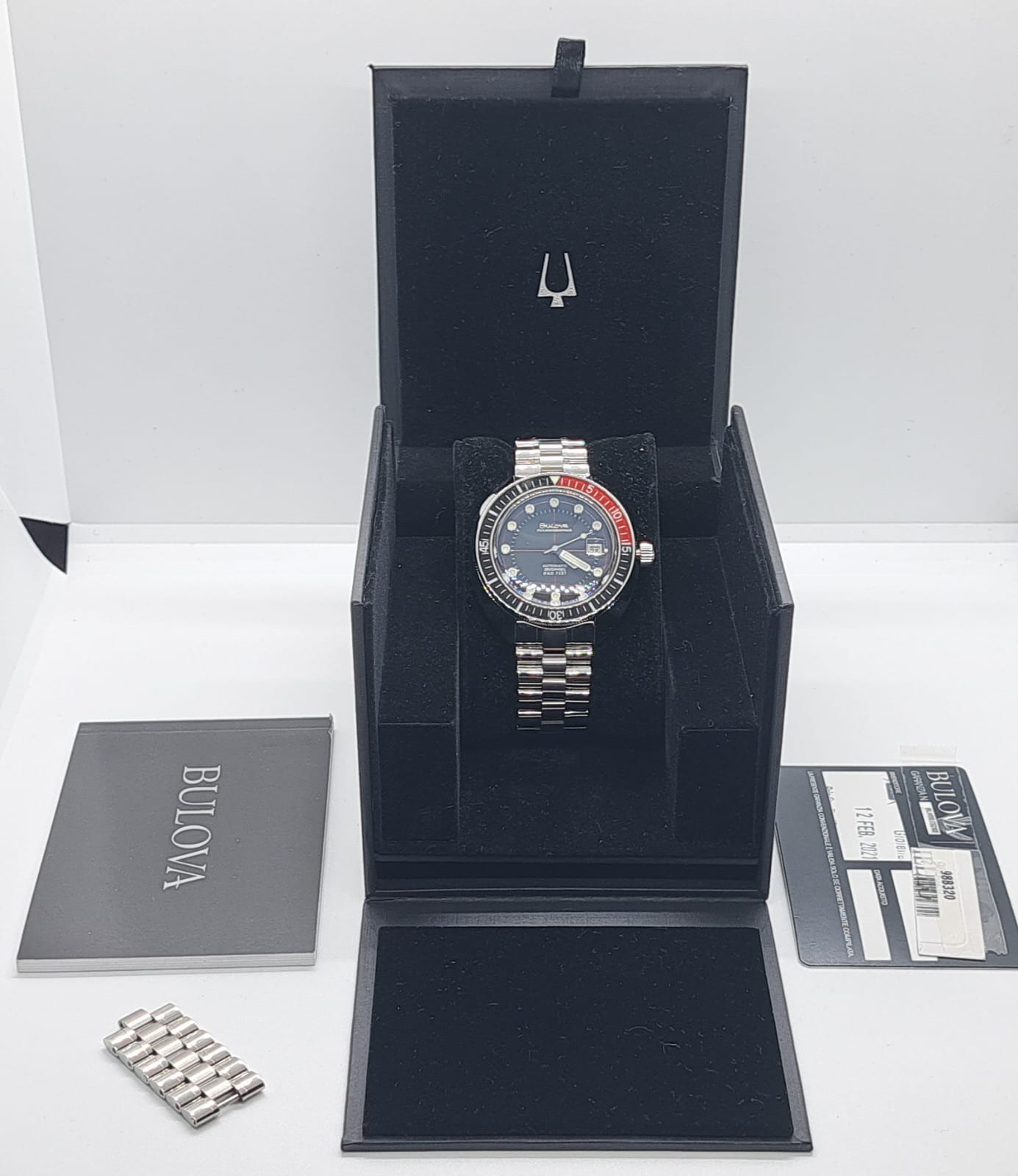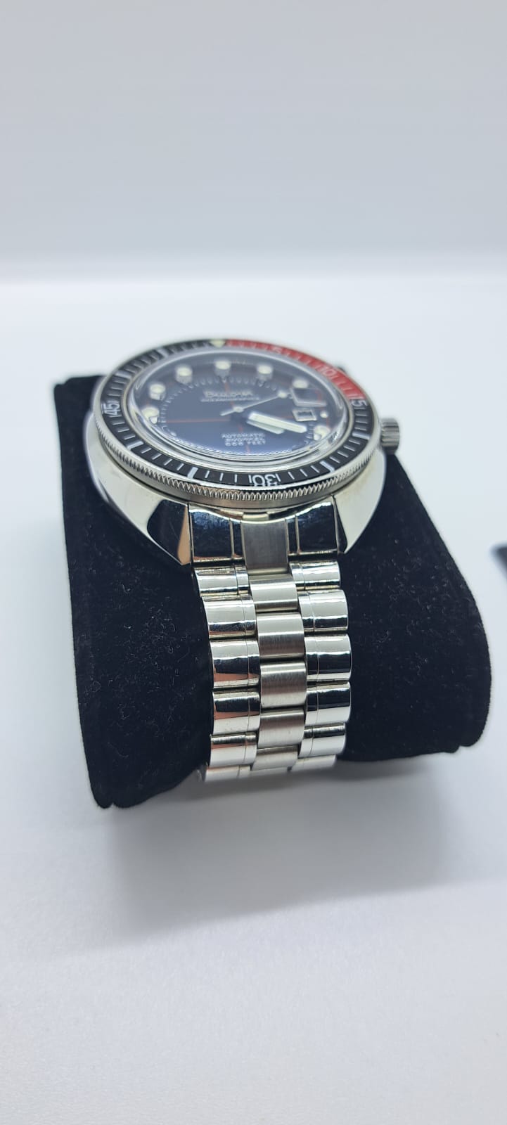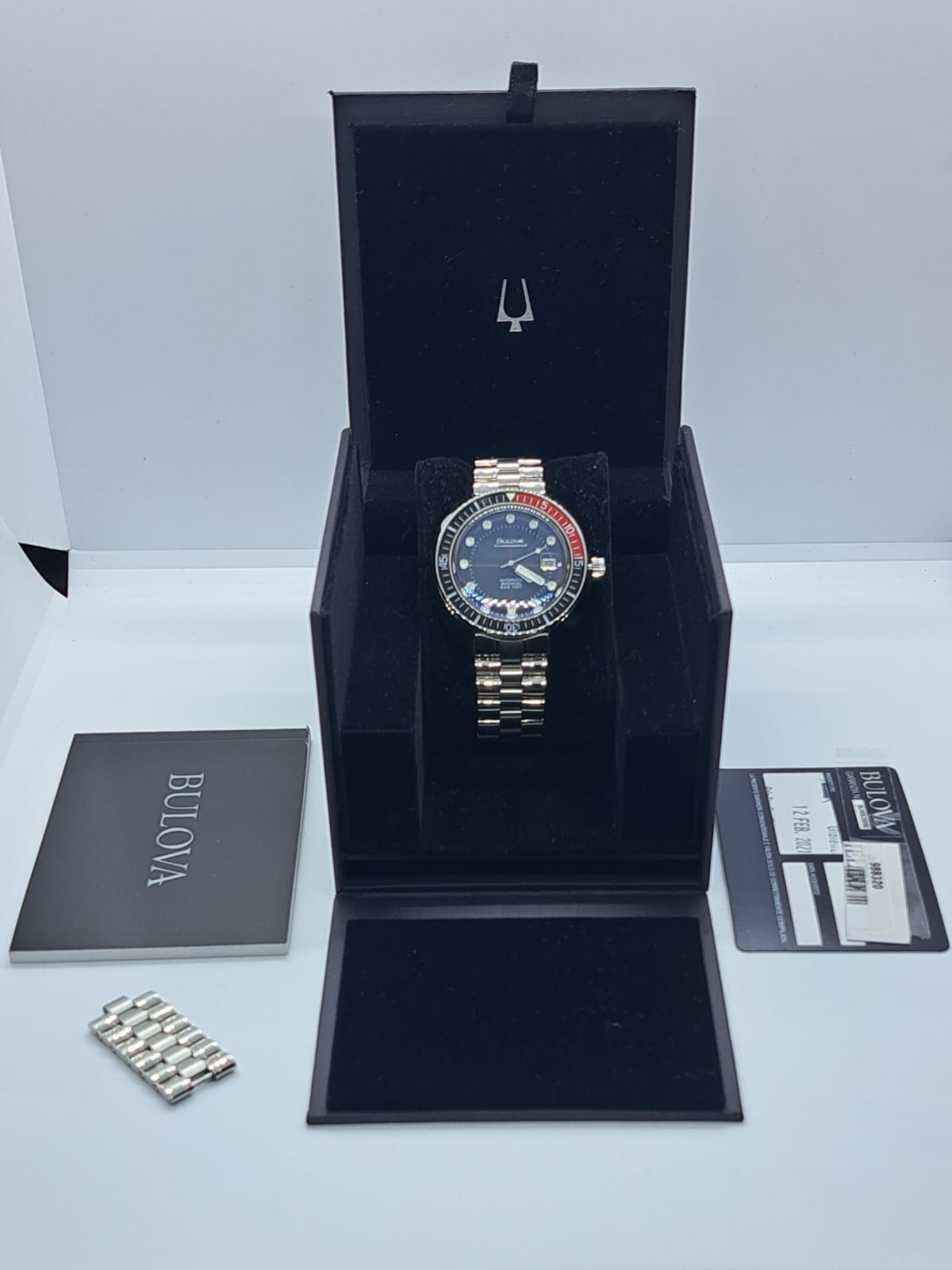 Bulova Oceanographer “Devil Diver”, un’icona che celebra la storia delle immersioni. Questo celebre segnatempo automatico fu introdotto nel mercato 1972. Il modello originale è un segnatempo automatico da immersione, dotato di una ghiera girevole con dettagli in nero e rosso. L’orologio si guadagnò il soprannome di “Devil Diver” quando Bulova indicò sul quadrante del modello originale degli anni ‘70 il valore d’impermeabilità in unità di misura americana “666 feet” invece dei tradizionali 200 metri. Full set. Spedizione tracciata e assicurata