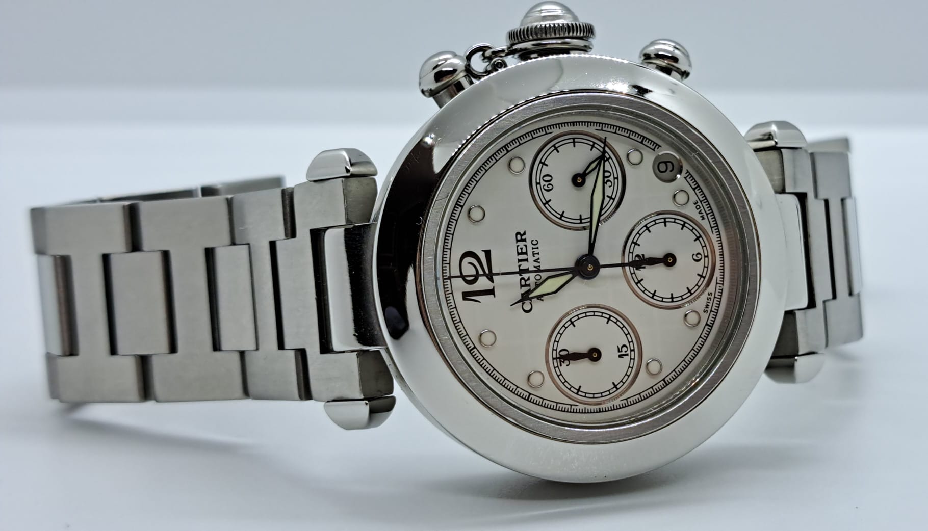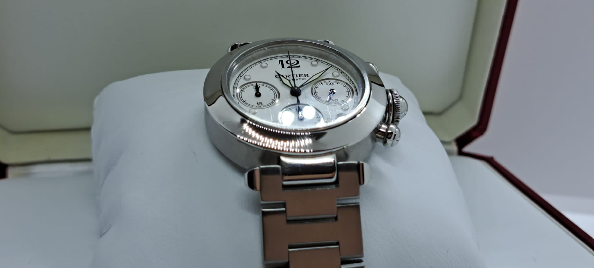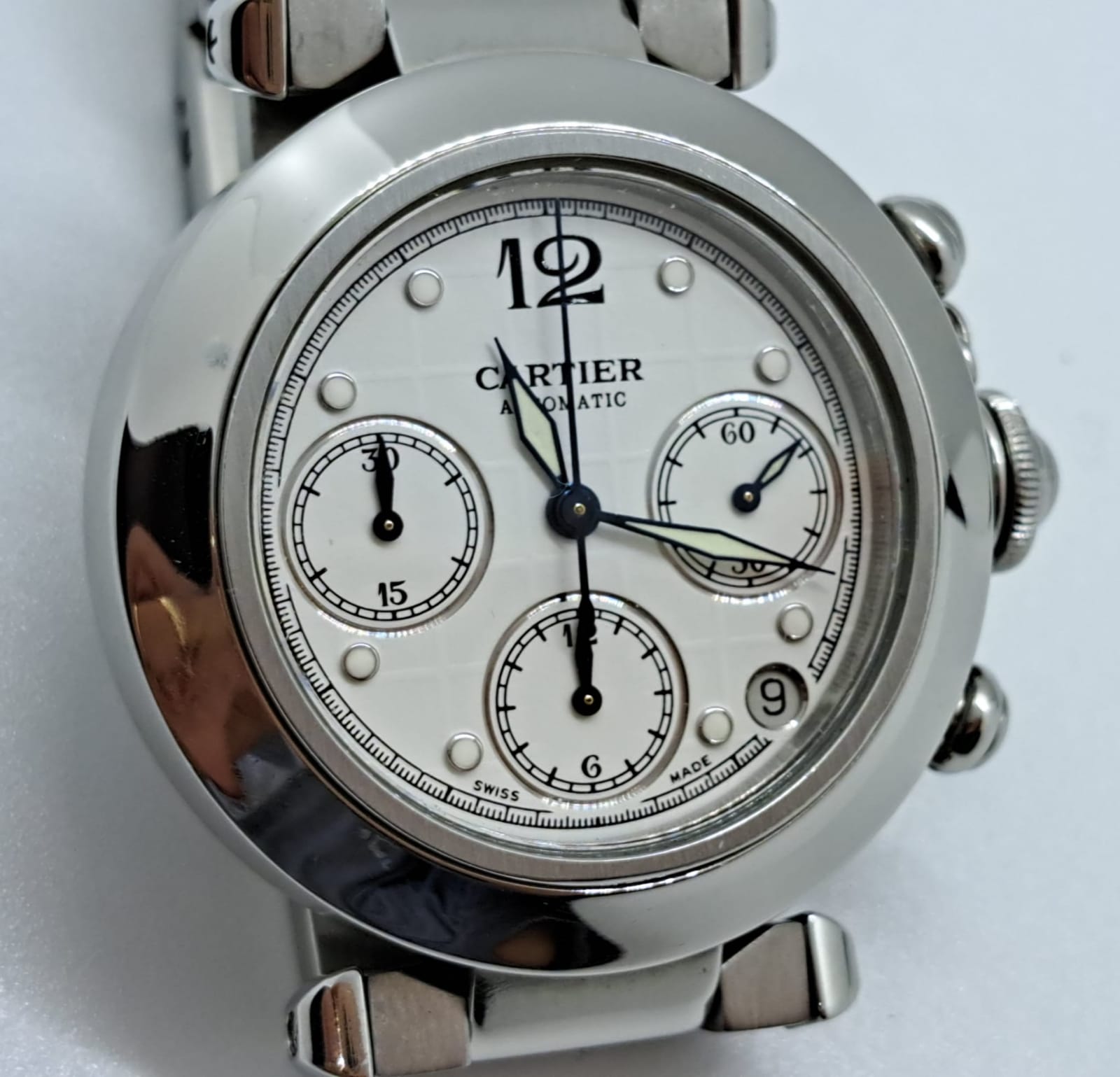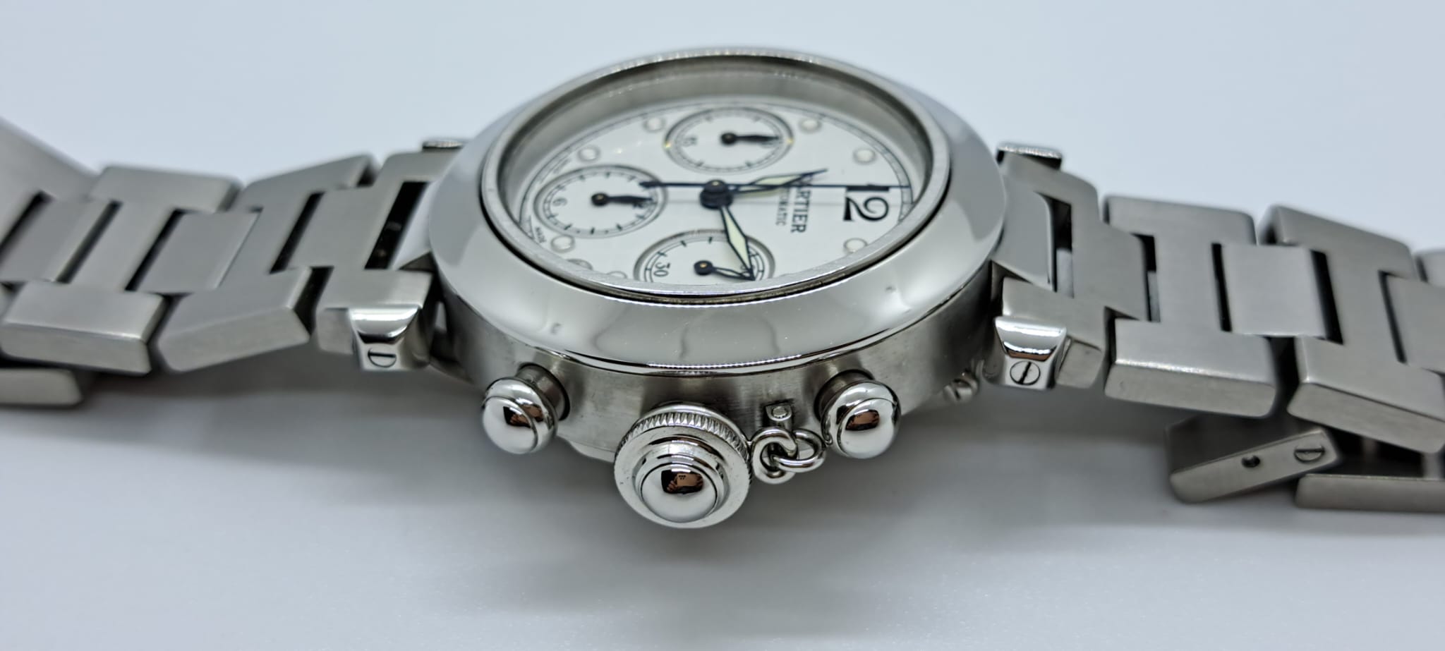 Cartier Pashà referenza 2412 Chronograph, cassa e bracciale in acciaio, quadrante bianco, movimento a carica automatica, diametro cassa 36mm, chiusura deployant, full full set pari al nuovo.