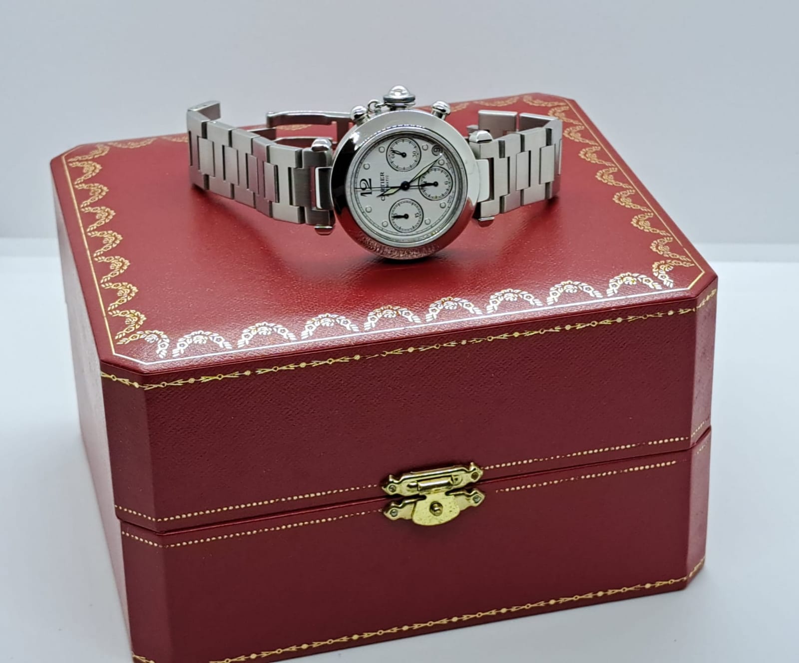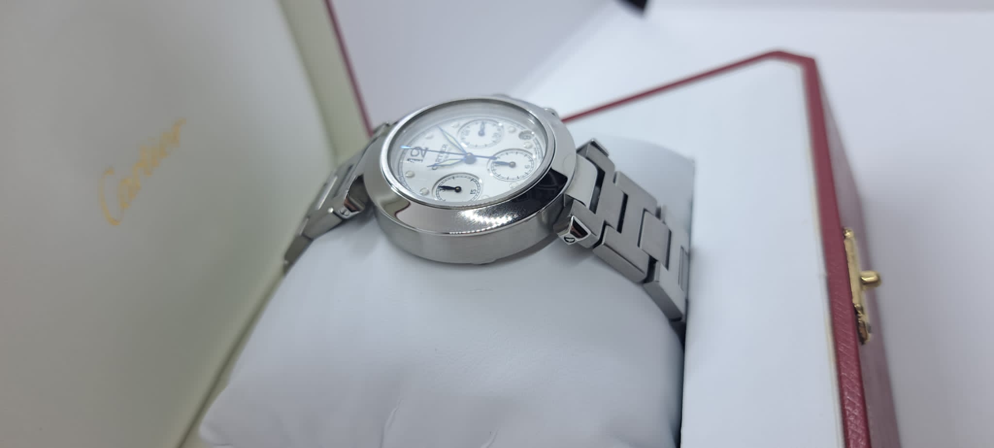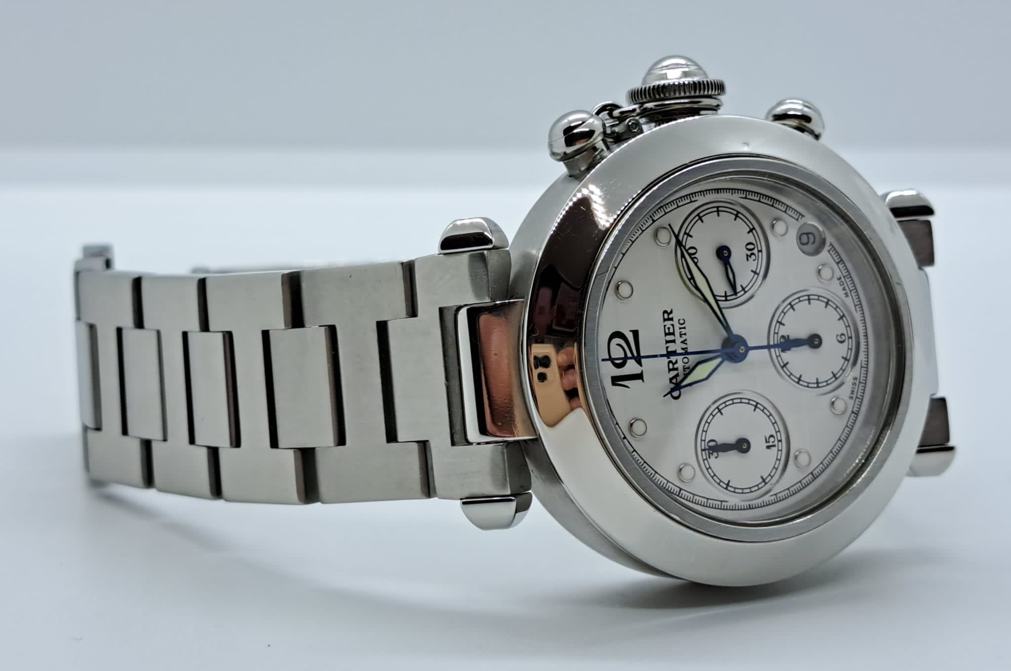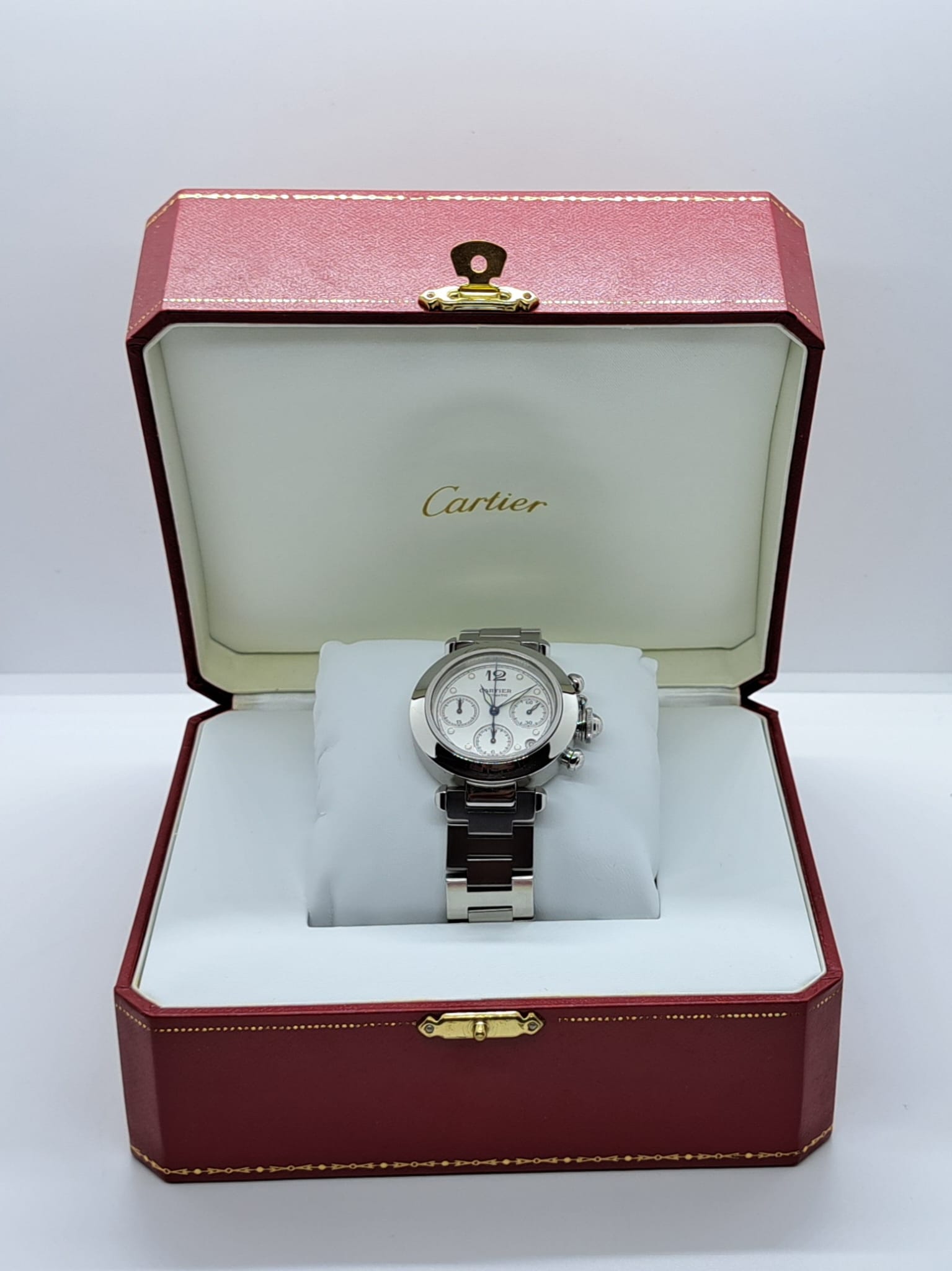 Cartier Pashà referenza 2412 Chronograph, cassa e bracciale in acciaio, quadrante bianco, movimento a carica automatica, diametro cassa 36mm, chiusura deployant, full full set pari al nuovo.