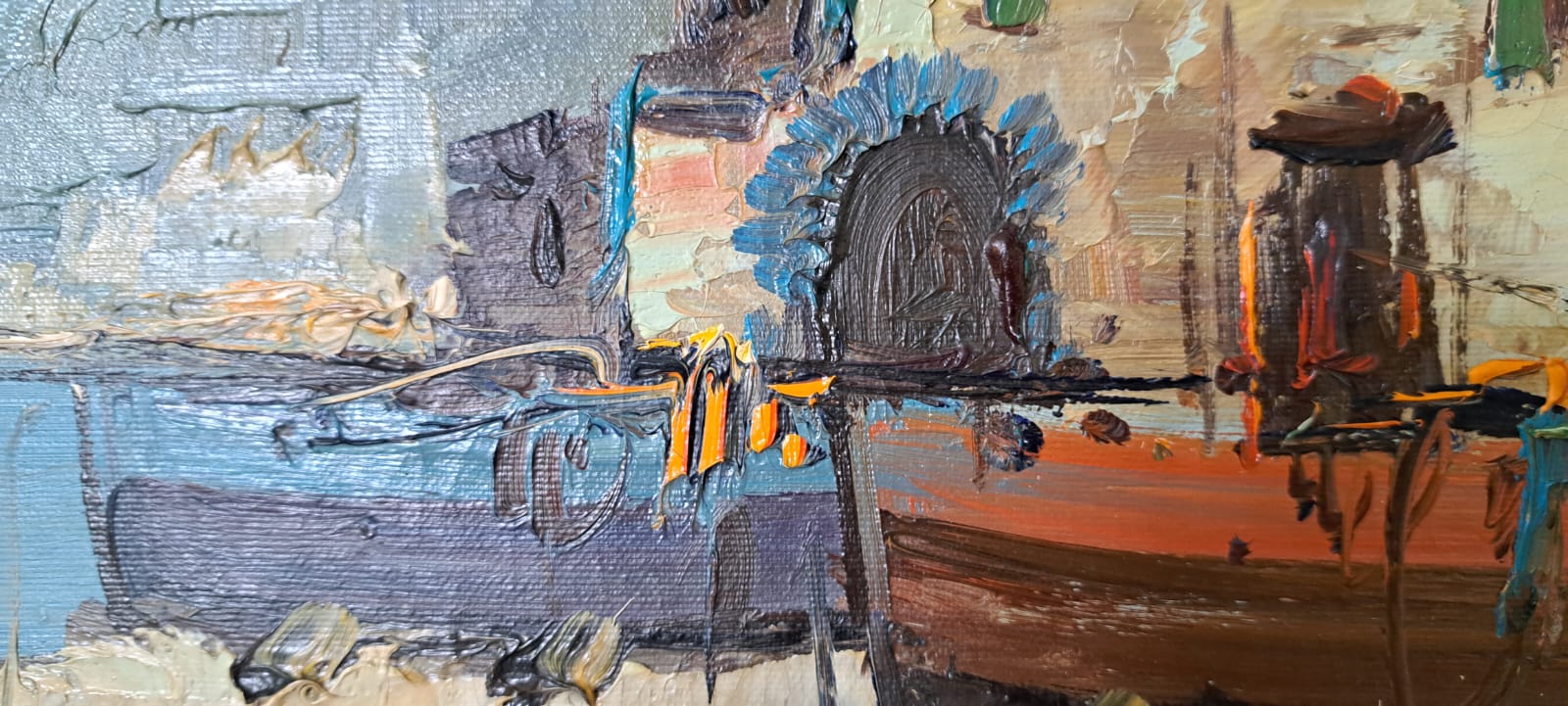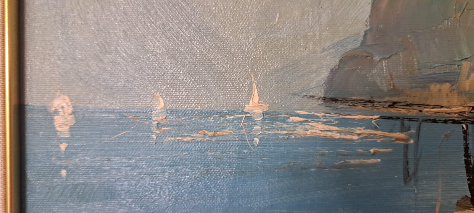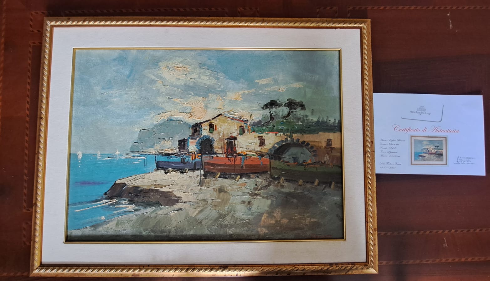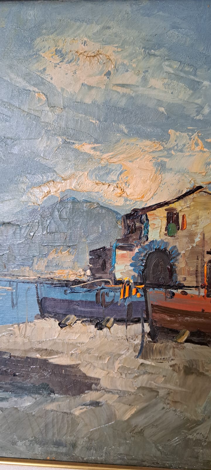 Il dipinto qui presentato un opera unica, I pescatori, firmato in basso a destra E. Briante Stato di conservazione Ottimo Dimensioni senza cornice 70×50 cm L’opera è corredata da una cornice d’epoca, che necessita di restauro o sostituzione. La cornice è da considerarsi un omaggio e misura 85×65 cm. L’opera viene venduta con certificato di autenticità del nostro negozio, corredato da foto come previsto dalla normativa vigente. La spedizione sarà professionalmente imballata, tracciata e assicurata. Il dipinto raffigura una scena costiera con pescatori e barche, probabilmente in un porto o vicino a una banchina. Lo stile è impressionistico, con pennellate visibili e colori vibranti che catturano l’atmosfera del momento, forse all’alba o al tramonto. Il cielo è dinamico, con nuvole che suggeriscono un cambiamento di luce.
