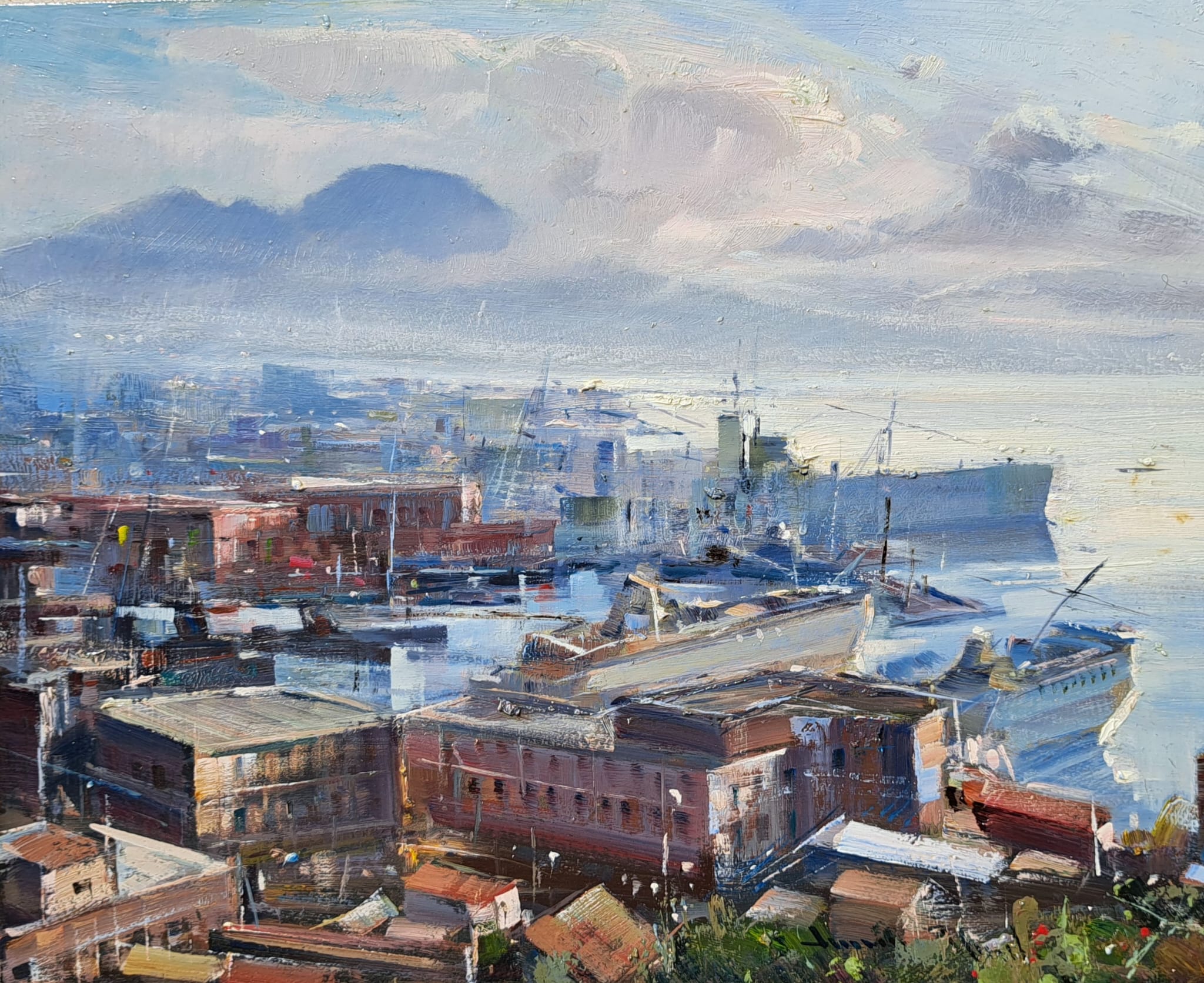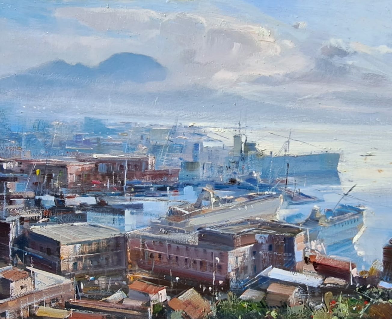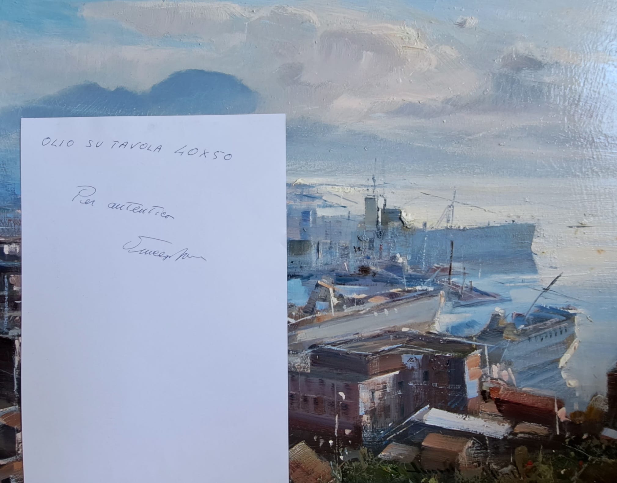 Vincenzo Aprile opera unica tecnica olio su tavola misura 30×50 cm titolo Il Porto