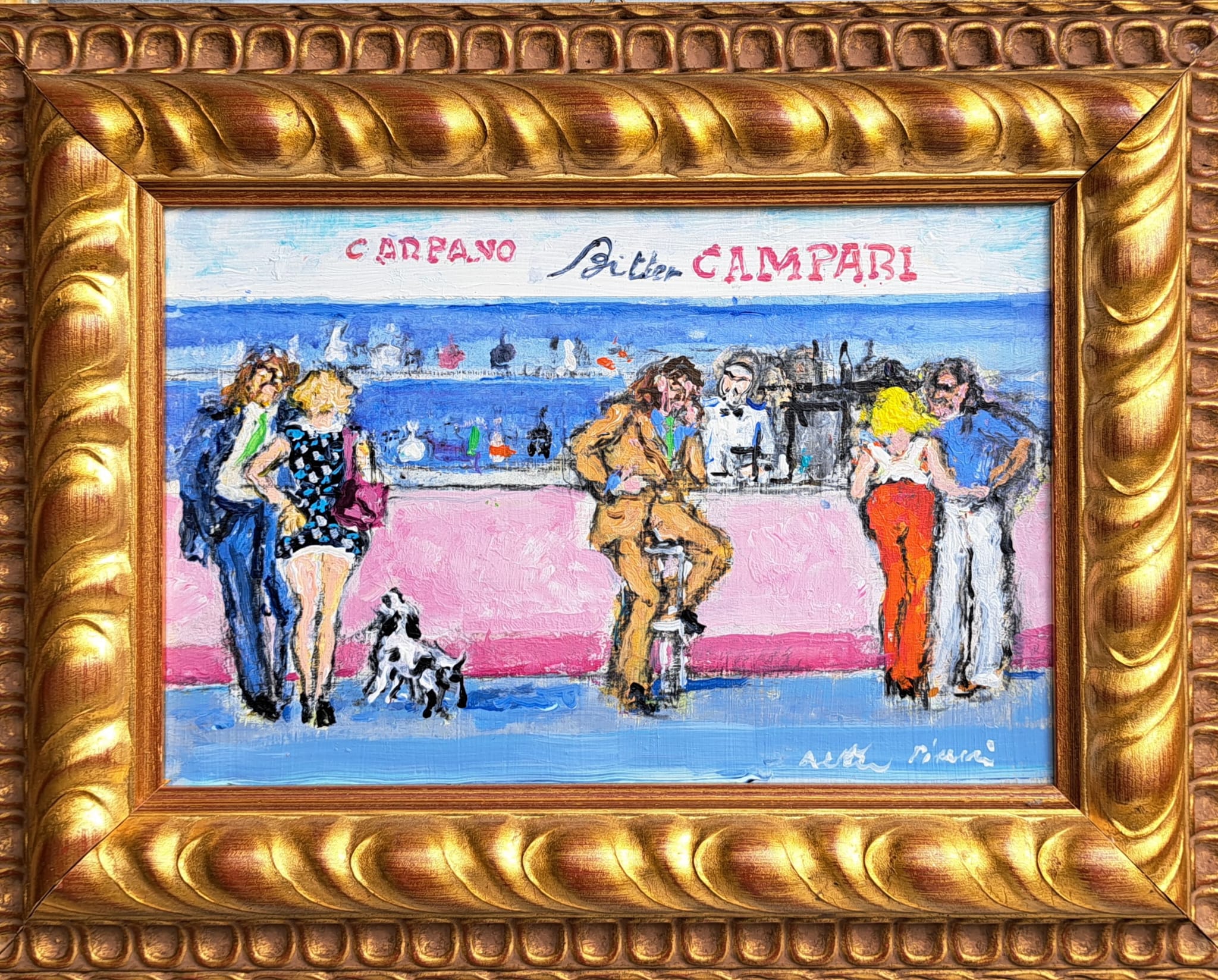 Opera unica di Walter Piacesi olio su tavola misura 20×30 cm titolo “Interno di Bar” completa di autentica e archivio ufficiale CA’ SPINELLO
