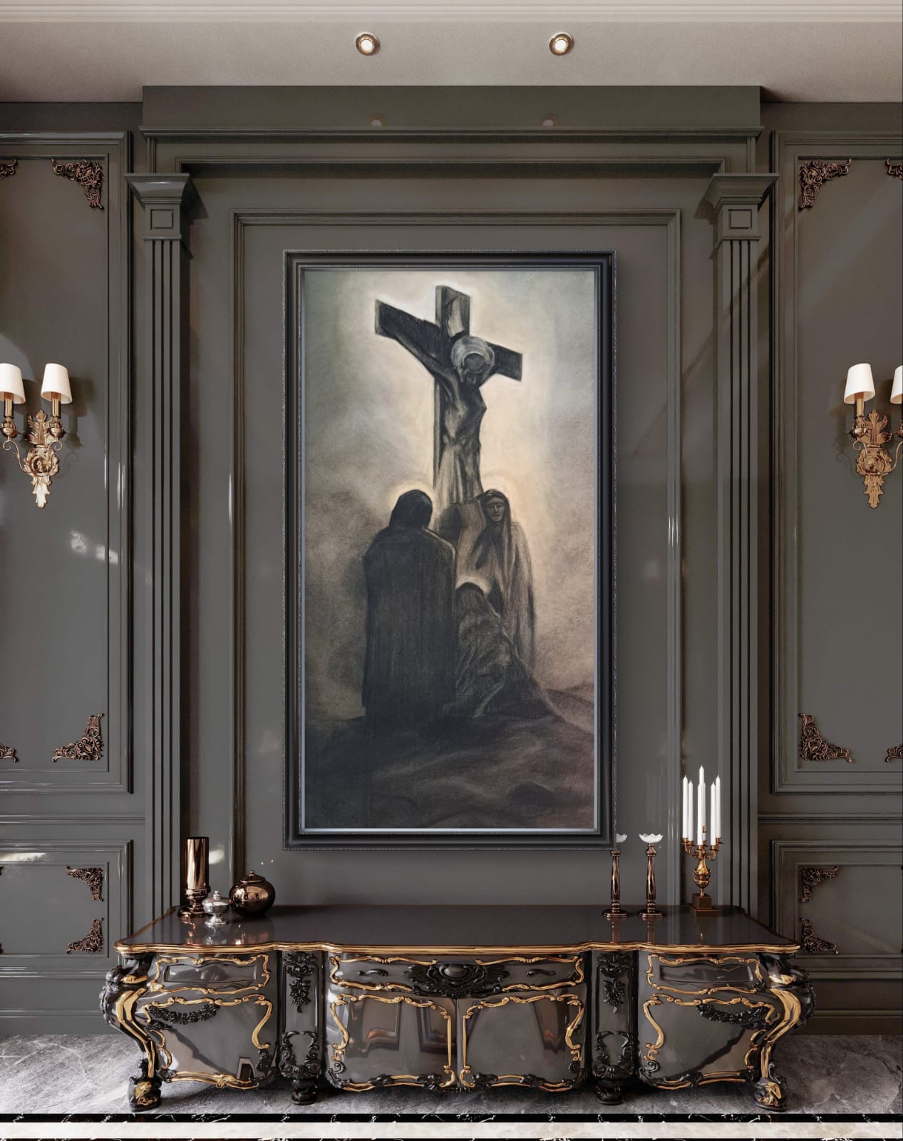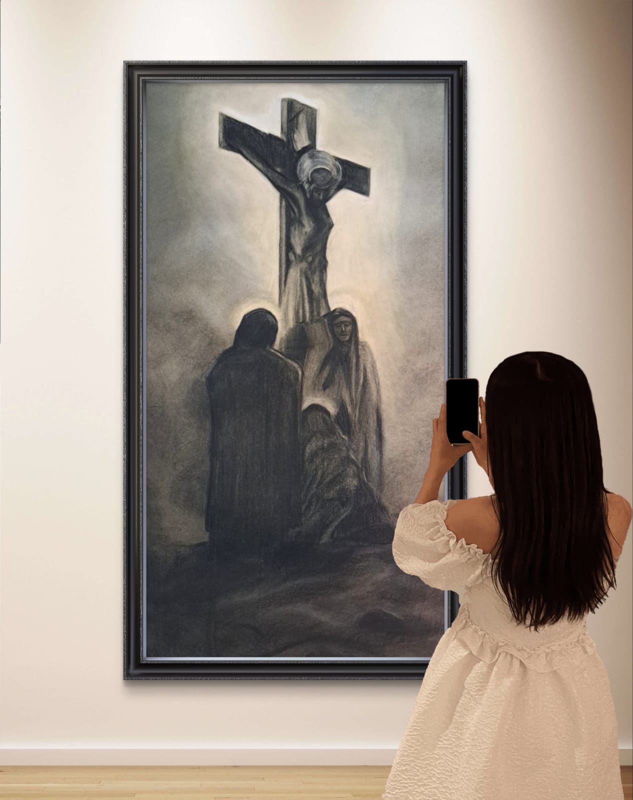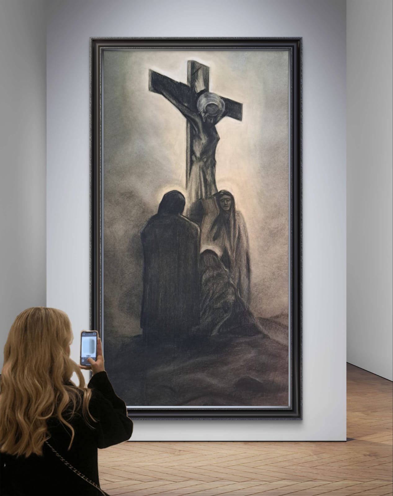 Il dipinto qui presentato un carboncino su carta risalente al 1800 circa, di dimensioni imponenti (120 cm per 70 cm), rappresenta una scena cruciale della cristianità: la crocifissione di Gesù. Ai piedi della croce sono raffigurate Maria, la madre di Gesù, Maria di Clèofa e Maria di Màgdala, figure centrali nella narrazione evangelica.