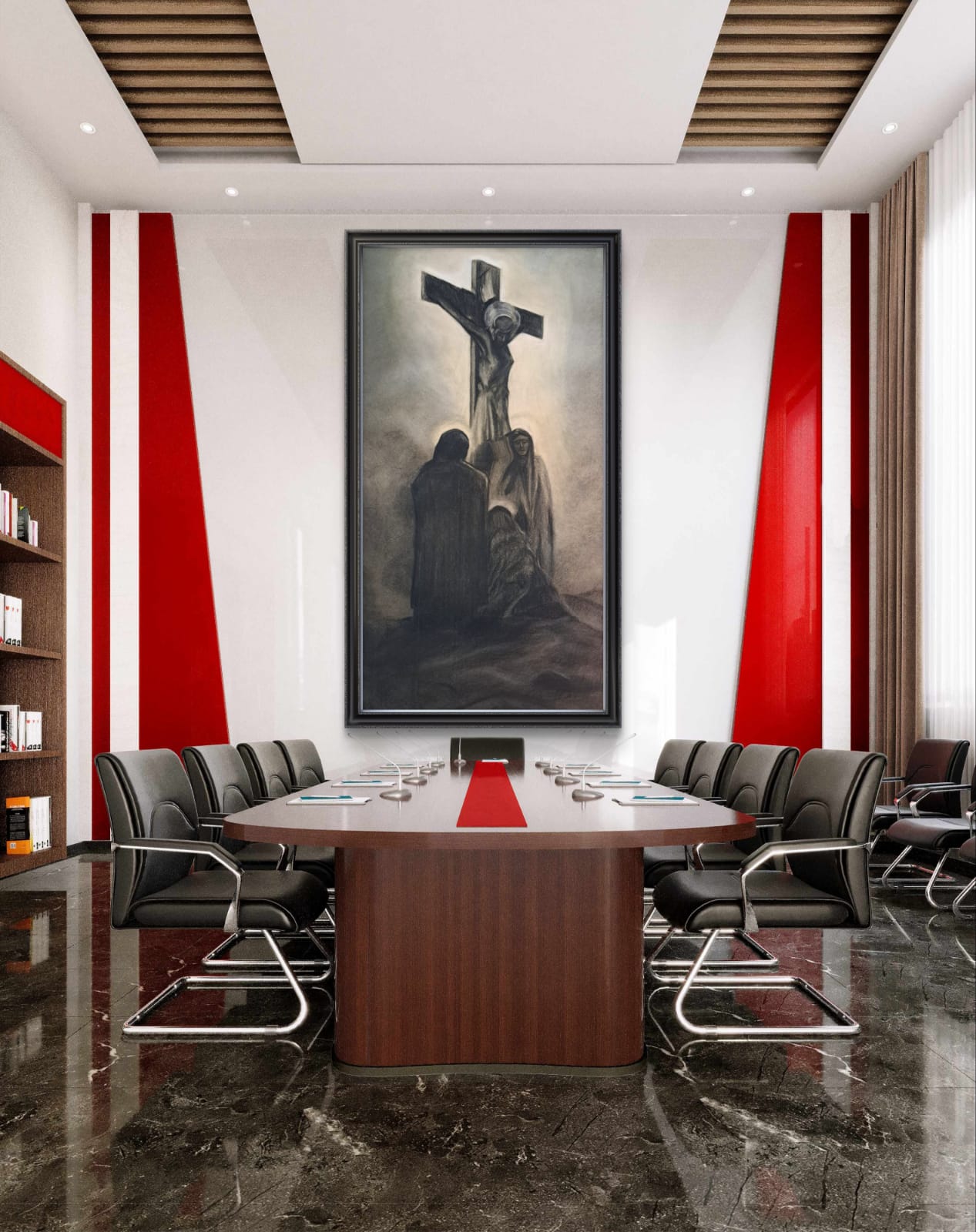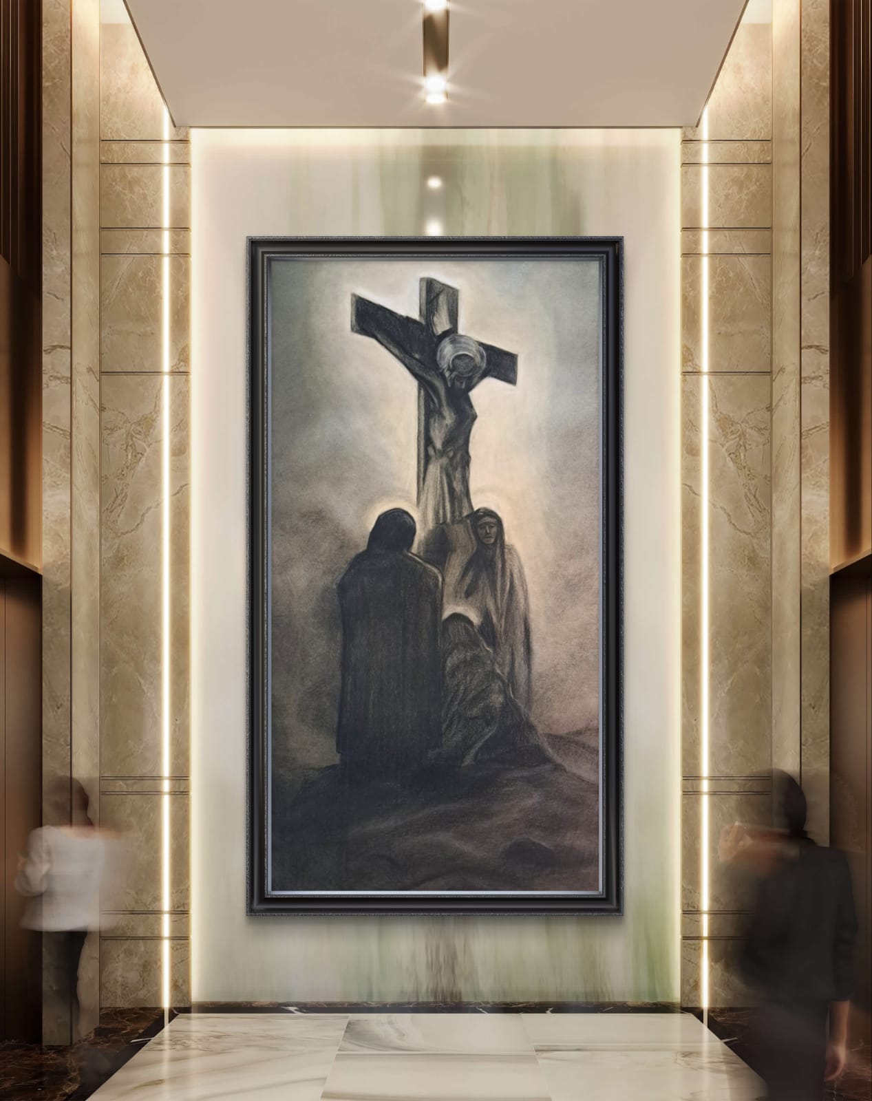 L’uso sapiente del chiaroscuro evidenzia l’opera nella sua interezza, mettendo in risalto il dolore e la devozione. Le ombre profonde intorno alla croce e ai corpi delle figure creano un effetto tridimensionale, facendo emergere i dettagli con una vividezza impressionante.