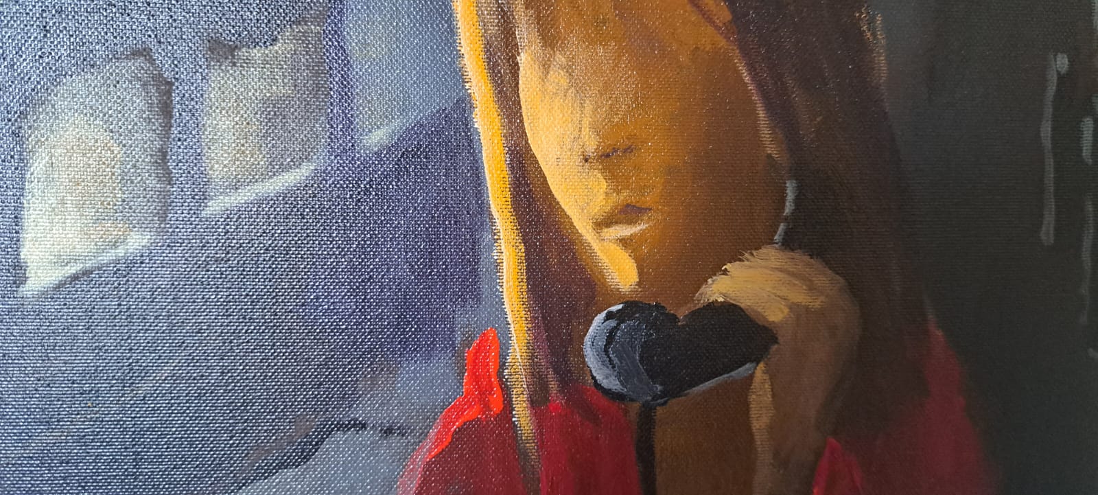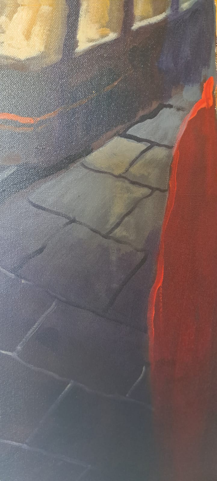 La ragazzina, immersa nella luce soffusa dei lampioni, sembra isolata nel suo mondo mentre comunica attraverso il telefono, un contrasto emotivo con l’ambiente urbano circostante. La sua presenza umana e la sua azione quotidiana forniscono un punto focale emotivo e narrativo all’interno della composizione.