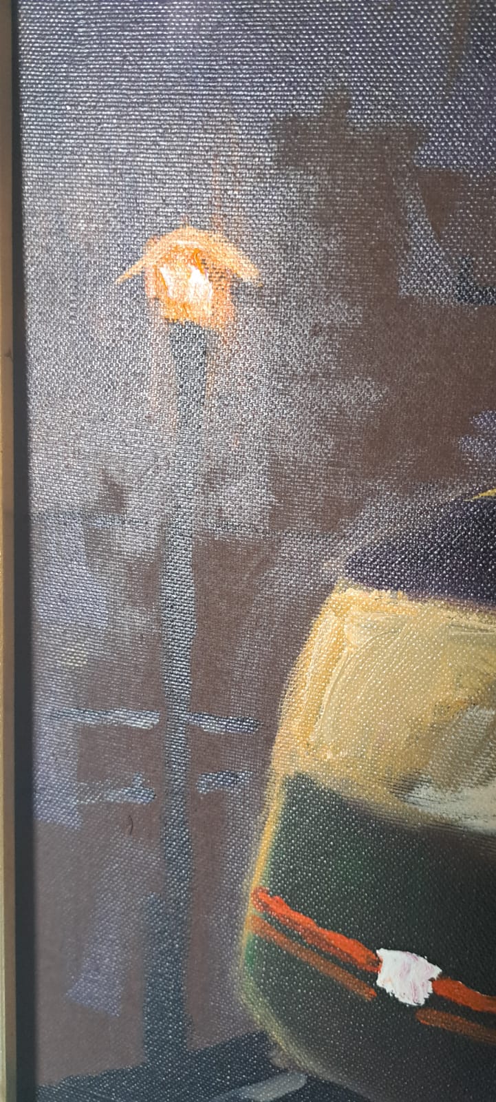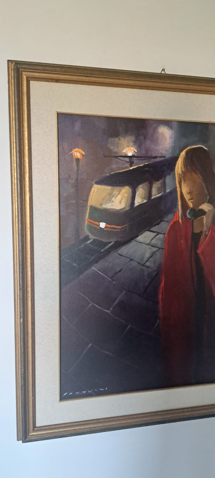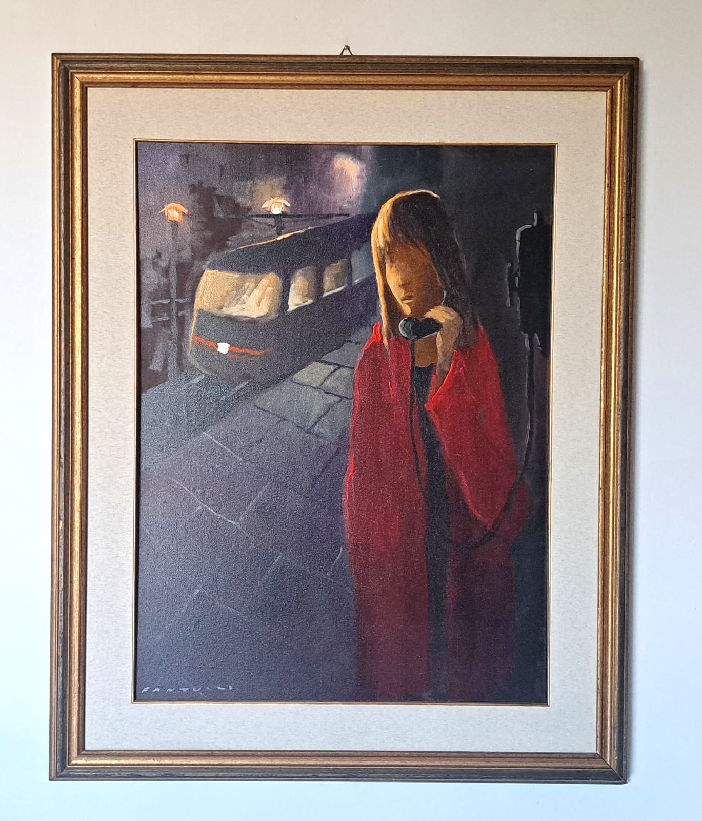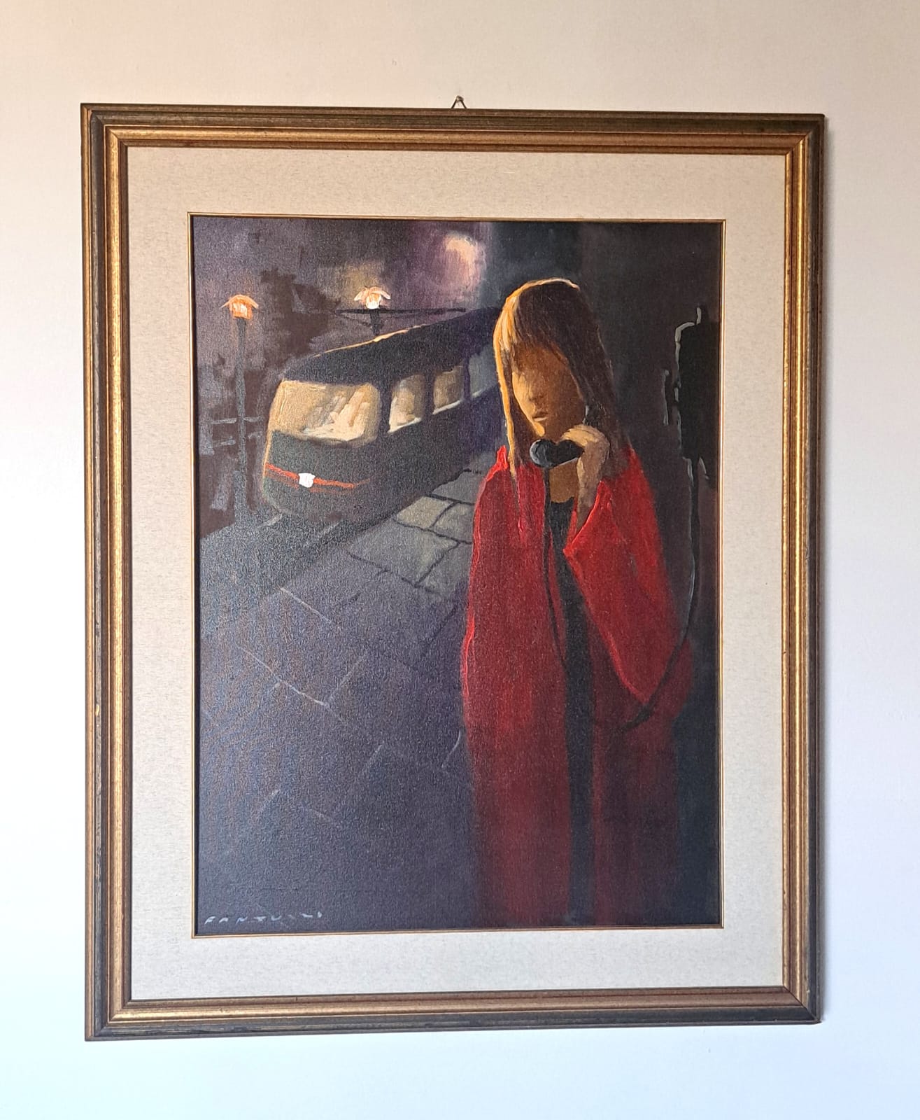 In conclusione, questo dipinto di Eliano Fantuzzi non solo cattura l’essenza della vita urbana notturna degli anni ’70 ma racconta anche una storia personale attraverso la figura della ragazzina al telefono. L’opera, con le sue dimensioni generose e la sua provenienza prestigiosa, rappresenta un pezzo di storia dell’arte italiana, un ponte tra il passato e il presente, tra l’intimità umana e l’ambiente urbano.