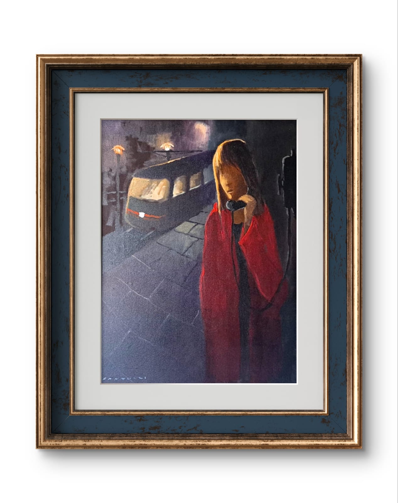 Importante dipinto, un olio su tela misura 103 cm per 83 cm (compresa la cornice), è un’opera significativa del maestro Eliano Fantuzzi. La scena notturna urbana è animata dalla presenza di una ragazzina, la figura centrale, che sta utilizzando un telefono pubblico. Questo dettaglio aggiunge un tocco di intimità e modernità, sottolineando la connessione tra gli individui e la tecnologia emergente dell’epoca.