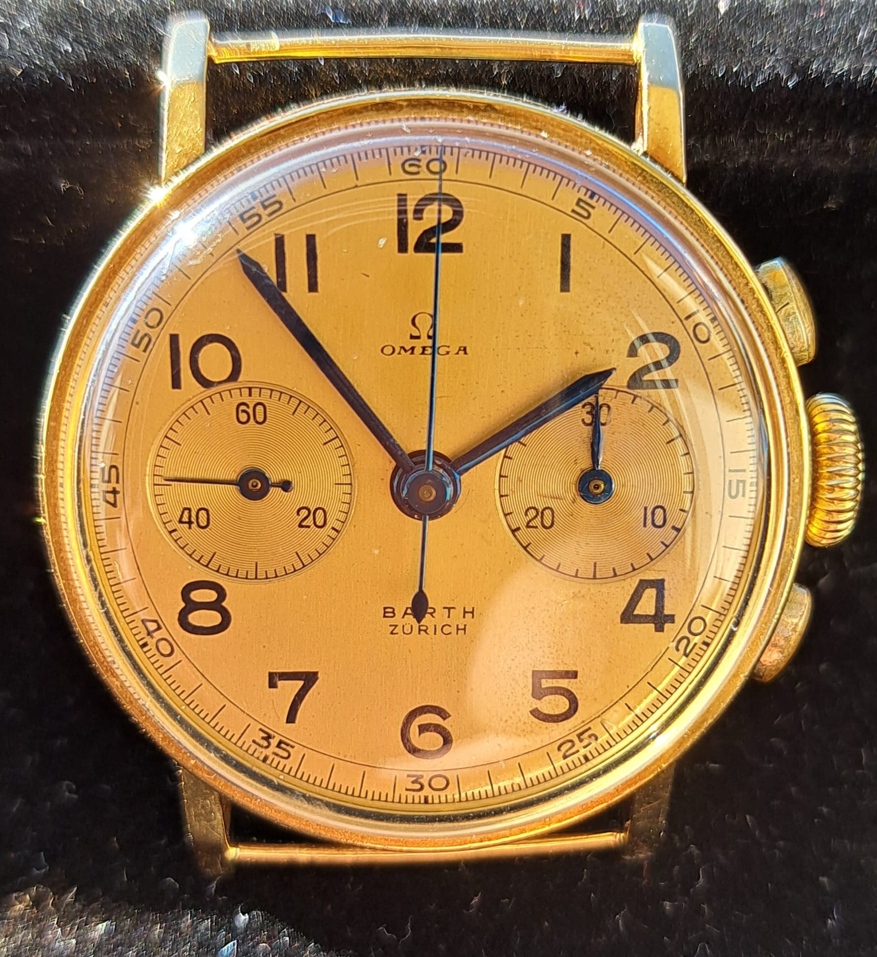 Un vero cimelio di casa Omega chronograph 28.9 T2 cassa in oro 18 kt 34 mm, pulsanti a oliva, corona originale, quadrante bronzo Barth Zurich con scala tachimetrica, Il calibro 28.9 fu introdotto come primo cronografo da polso di produzione degli orologi Omega nel 1932 con 17 rubini, bilanciere Breguet e lancetta dei minuti continua. Lemania ha prodotto i movimenti per Omega ed è stato realizzato in piccolissime quantità per poco più di dieci anni. Lemania ha prodotto tre tipi di movimento calibro CH13/28.9: T1, che utilizzava un solo pulsante, e T2 e T3, che utilizzavano due pulsanti. Il movimento era a carica manuale.Il calibro 28.9 è stato concepito principalmente come piccolo cronografo da polso da indossare per lo sport o da professionisti ed è stato commercializzato principalmente a sportivi e piloti. L’orologio è stato introdotto in forma di produzione nel 1932 ed è stato prodotto in quantità molto ridotte fino al 1943 circa.L’ orologio è stato prodotto con una serie di varianti del quadrante cronografo, alcune in smalto e altre in ottone verniciato, inclusi alcuni prototipi molto rari come il cronografo con driver inseriti risalente al 1937 circa.I cronografi calibro 28.9 sono oggi estremamente rari e come tali molto ricercati da collezionisti e appassionati.
