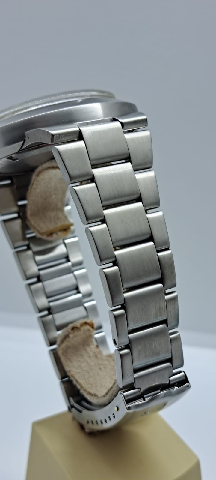 In condizioni da concorso, questo orologio è un fondo di magazzino dell’epoca, mantenuto intatto per preservare la sua autenticità. È presente solo una piccola frattura sul vetro in plexiglass, facilmente sostituibile a costo minimo, ma volutamente lasciata al suo stato originale per permettere all’acquirente di decidere se intervenire.