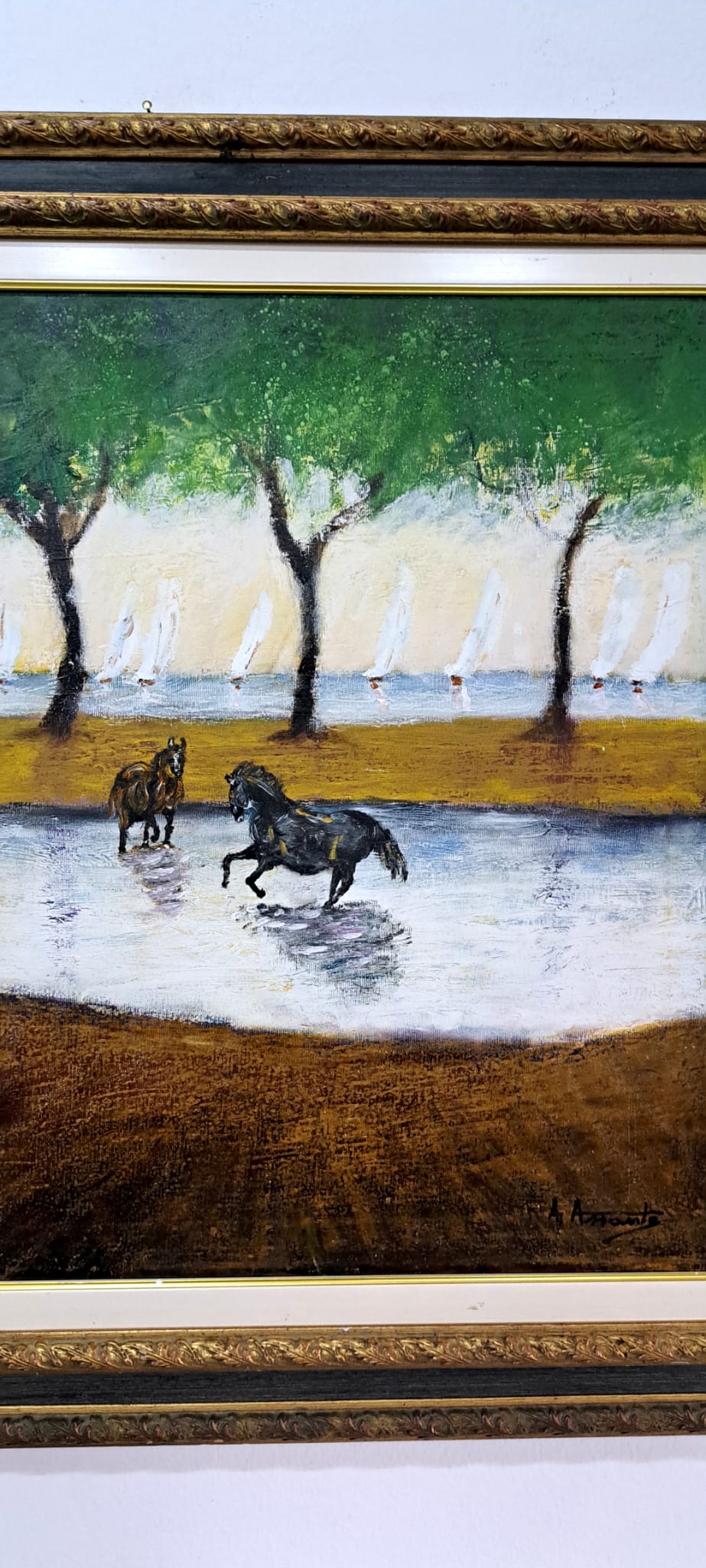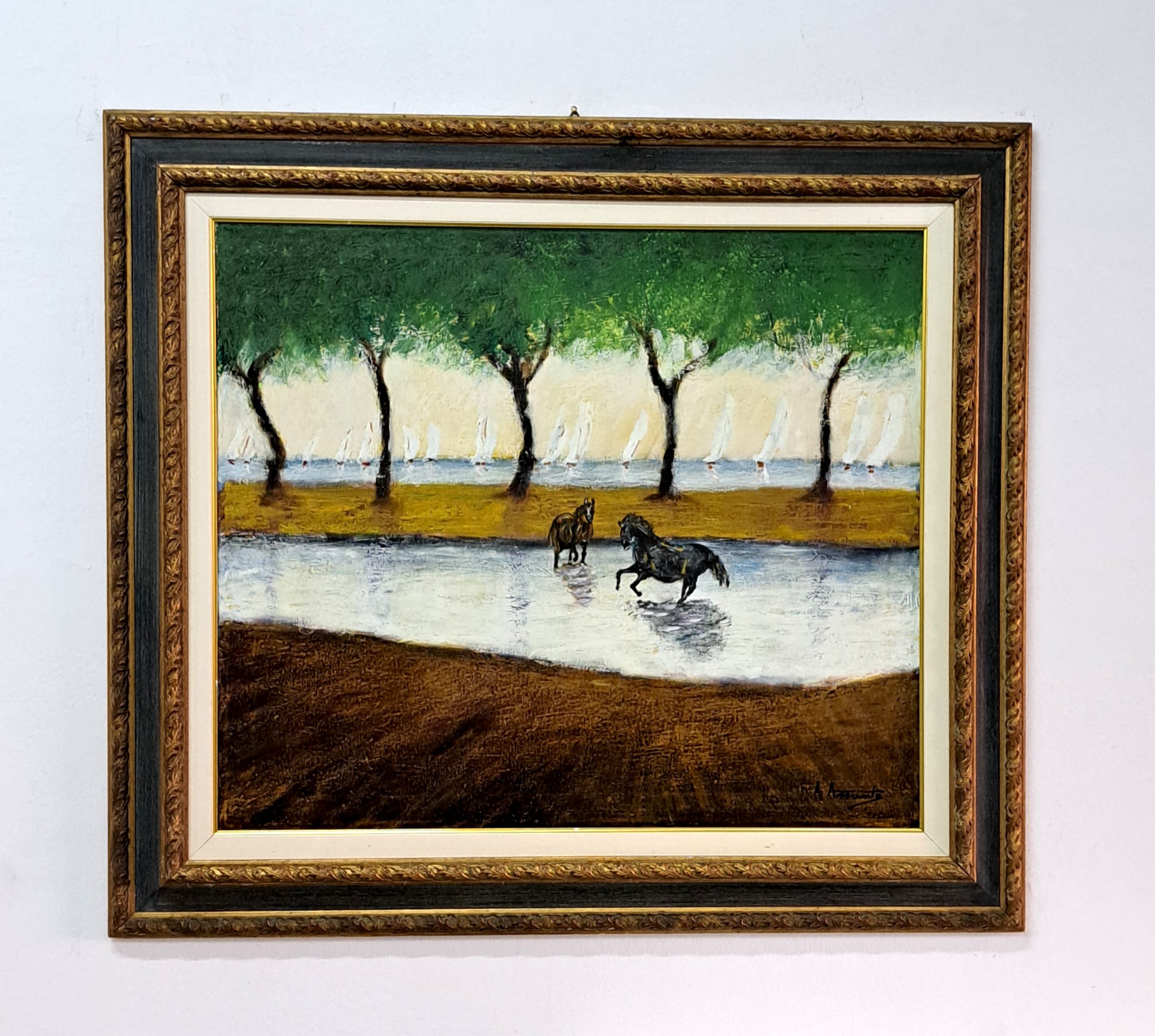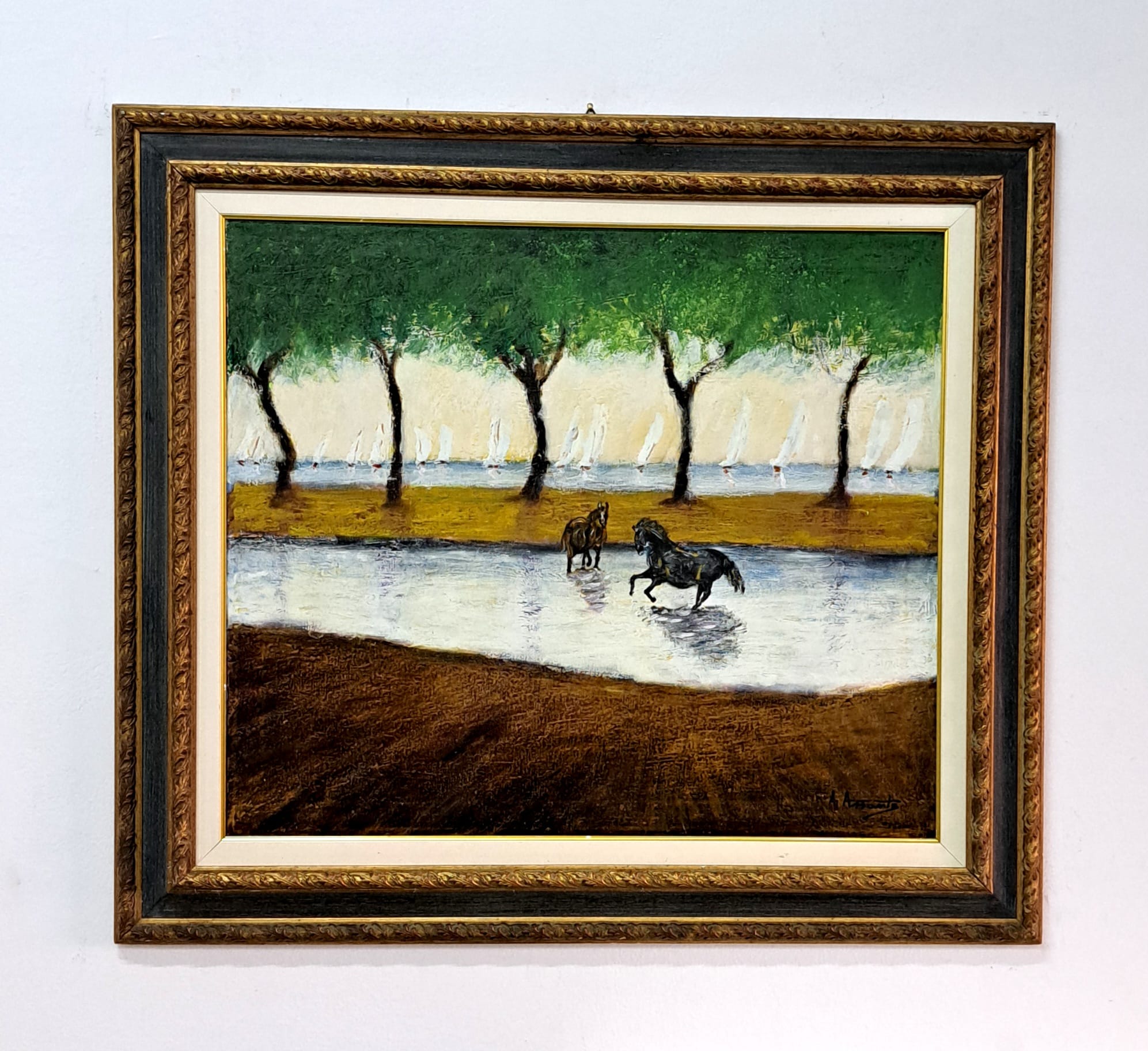 L’opera è un olio su tela che mostra la maestria di Arturo Assente nella rappresentazione di paesaggi. Le pennellate sono visibili e deliberate, creando una texture ricca e una profondità che cattura l’osservatore. I cavalli, immersi in un corso d’acqua, sono resi con dettagli accurati, mentre gli alberi e le barche a vela sullo sfondo aggiungono un senso di tranquillità e movimento alla scena.