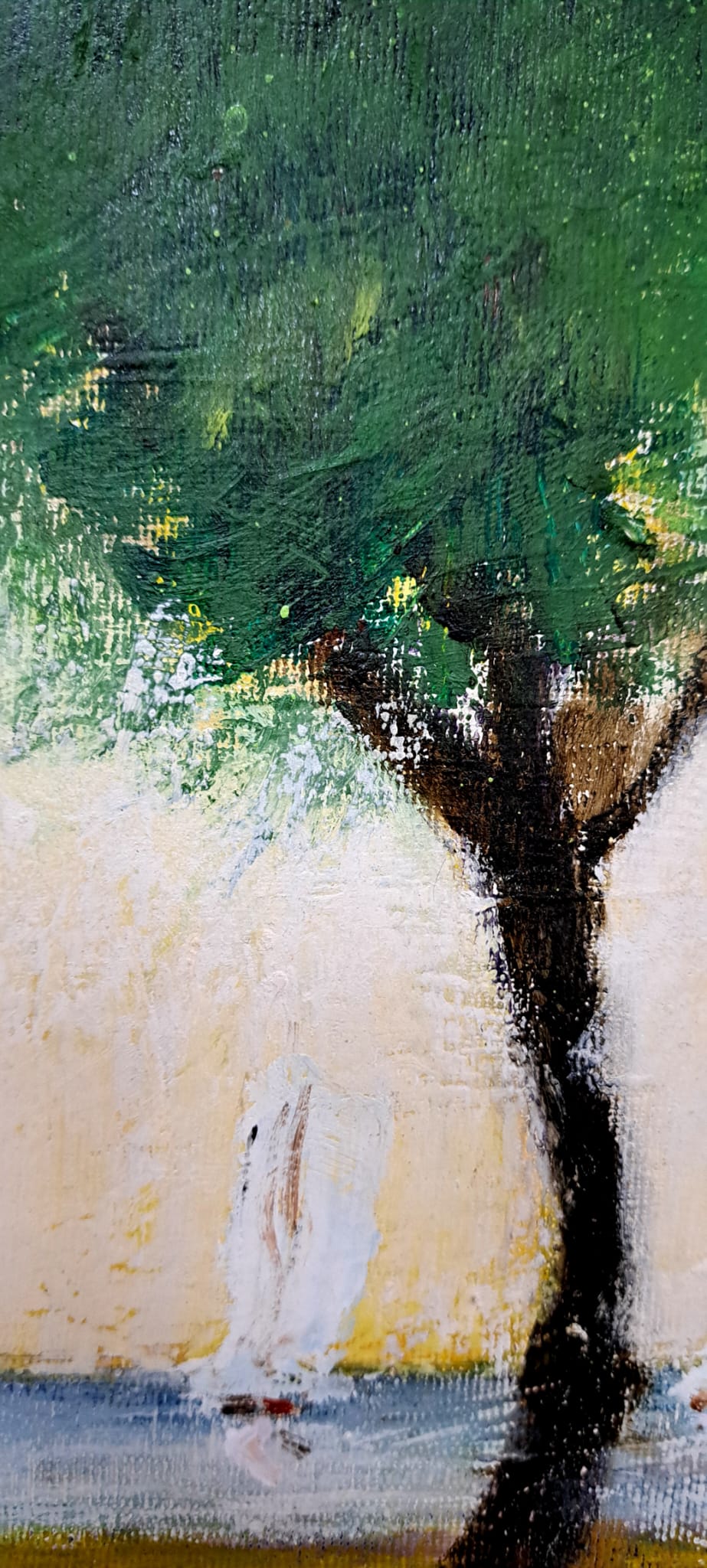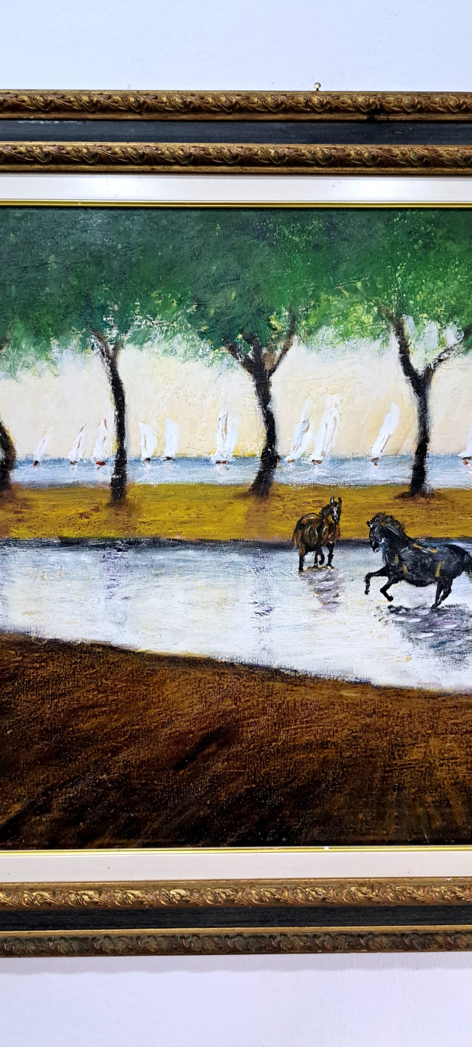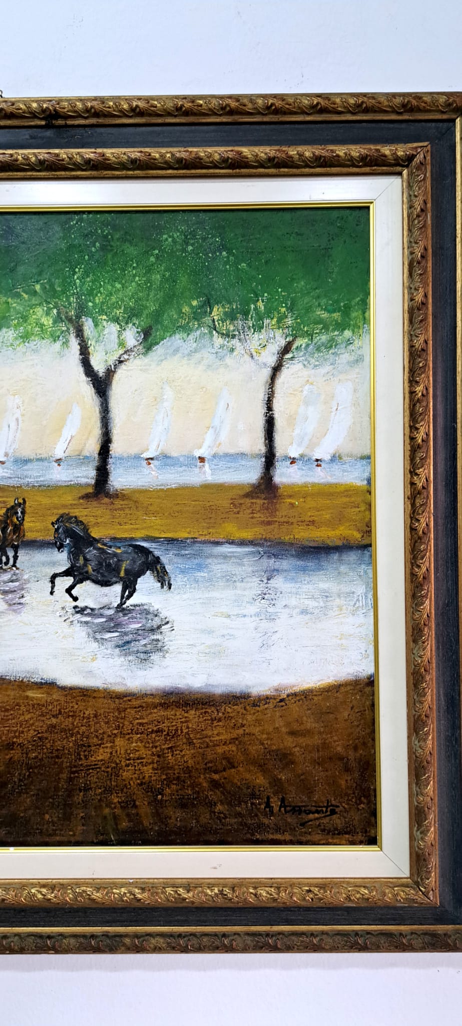 L’opera è un olio su tela che mostra la maestria di Arturo Assente nella rappresentazione di paesaggi. Le pennellate sono visibili e deliberate, creando una texture ricca e una profondità che cattura l’osservatore. I cavalli, immersi in un corso d’acqua, sono resi con dettagli accurati, mentre gli alberi e le barche a vela sullo sfondo aggiungono un senso di tranquillità e movimento alla scena.