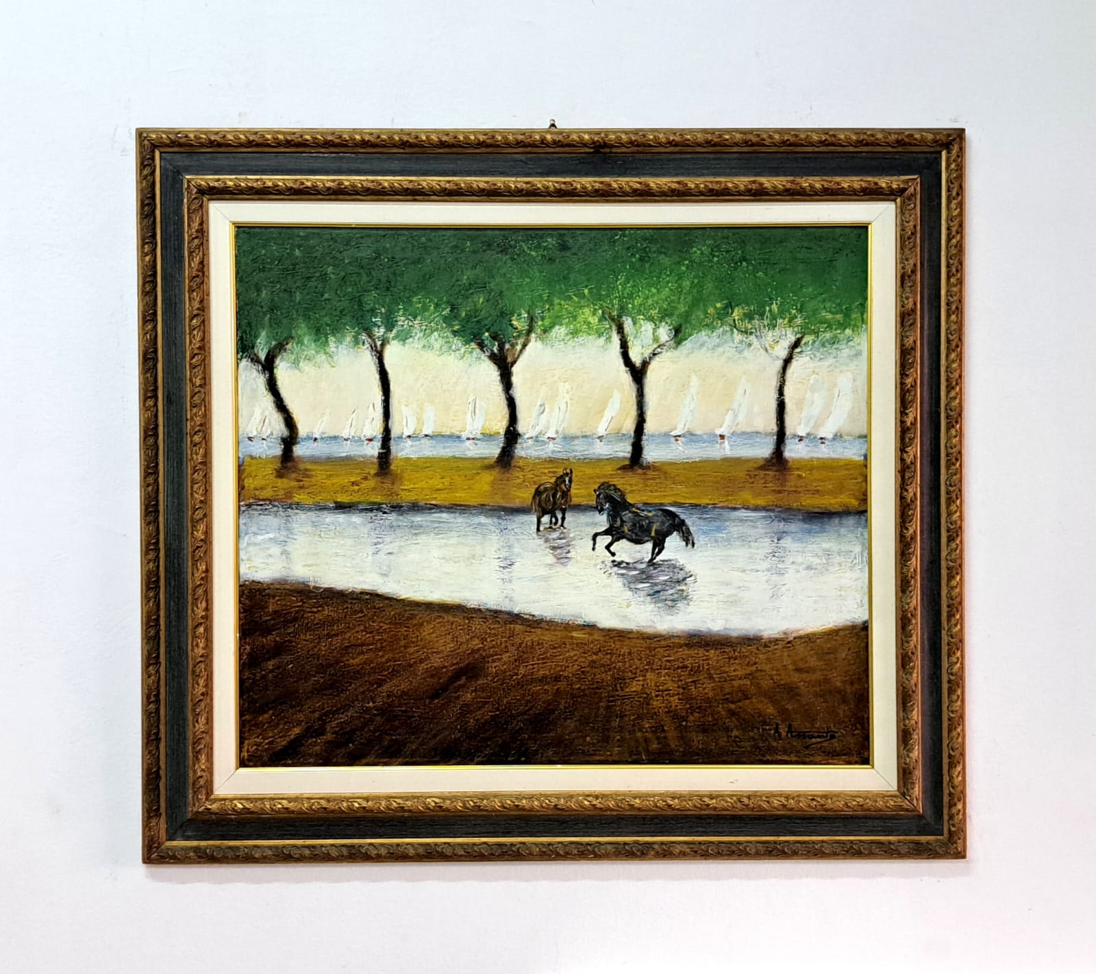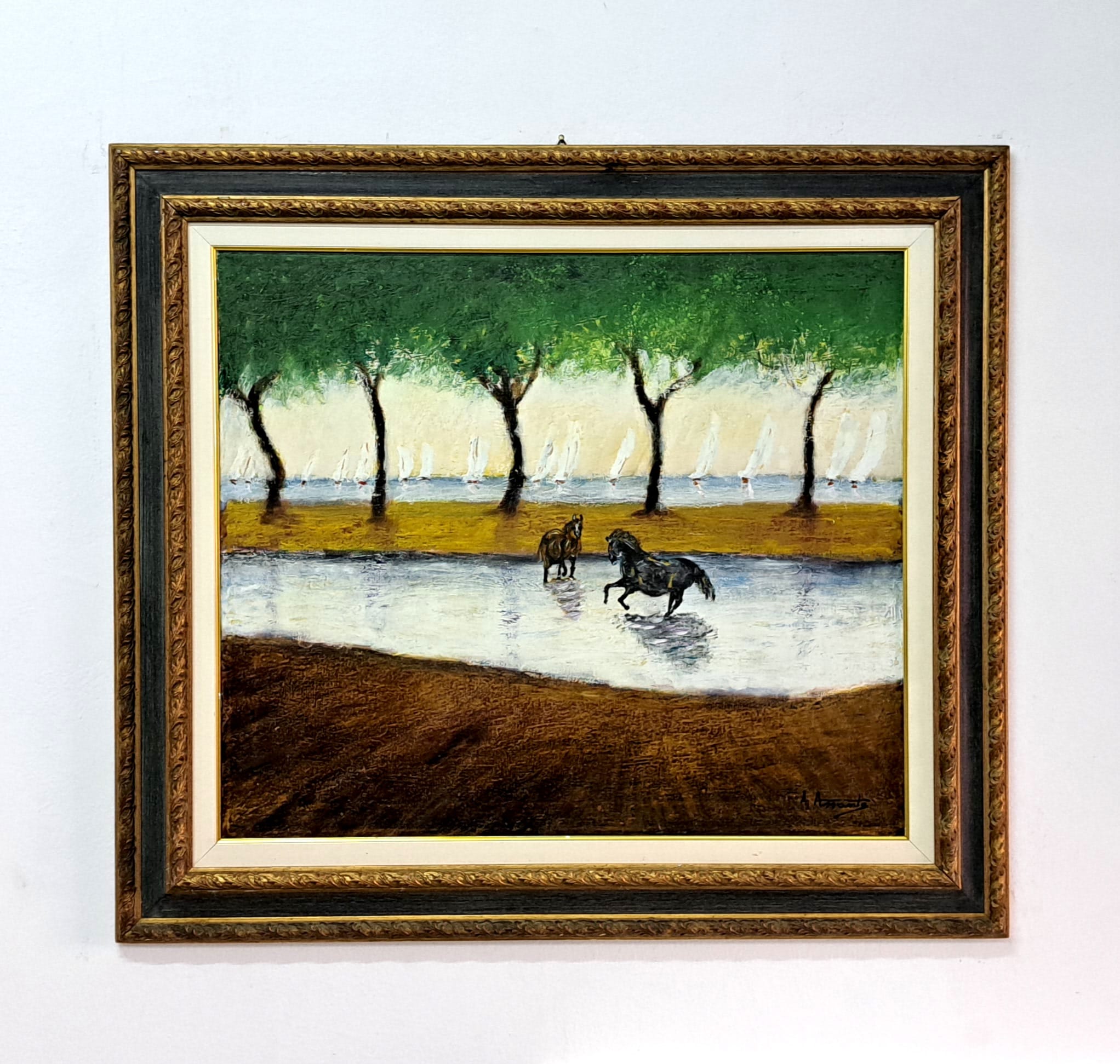 Il dipinto qui presentato un Paesaggio con Cavalli e Barche a Vela, di Arturo Assente del 1994