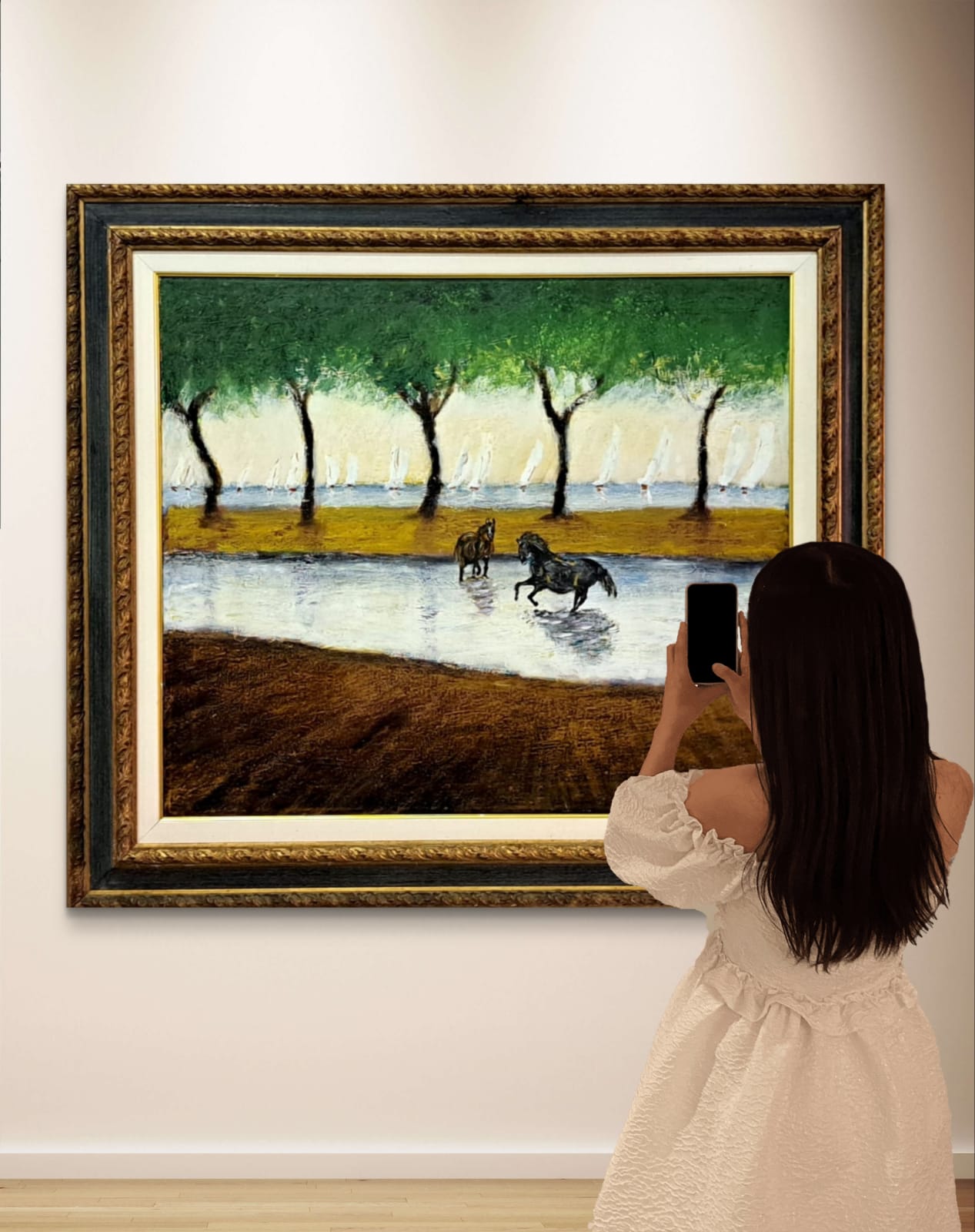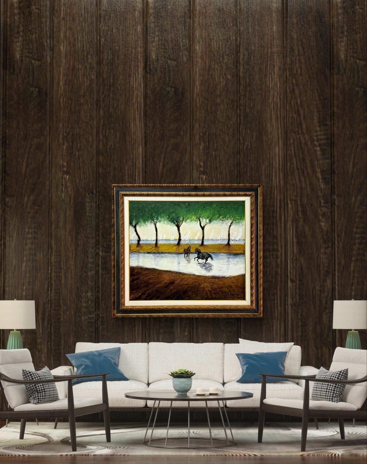 Questo dipinto rappresenta la serenità e la bellezza della natura, con i cavalli simbolo di libertà e forza, e le barche a vela che suggeriscono un viaggio o un’avventura. La combinazione di questi elementi crea un’atmosfera di pace e contemplazione.