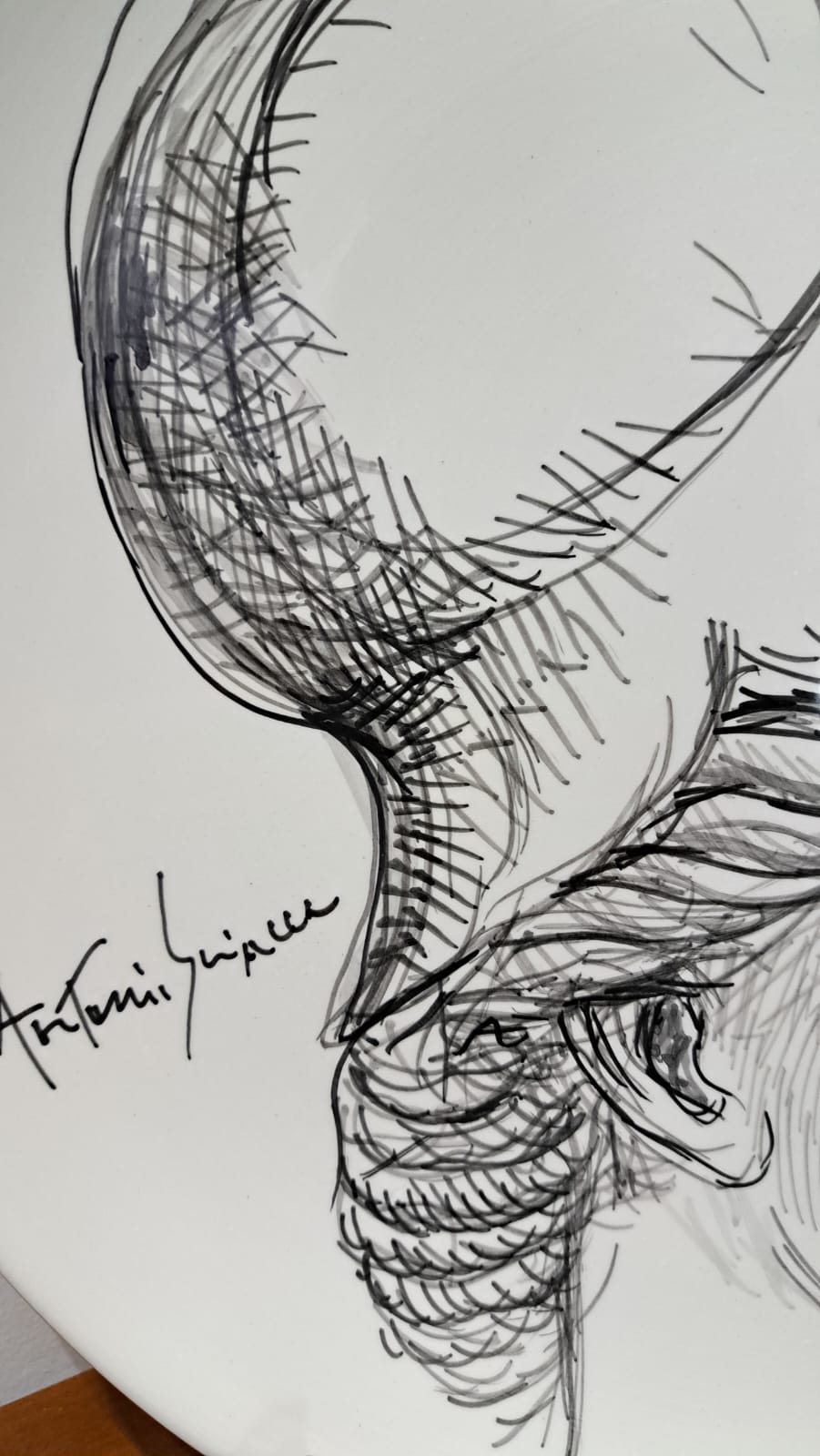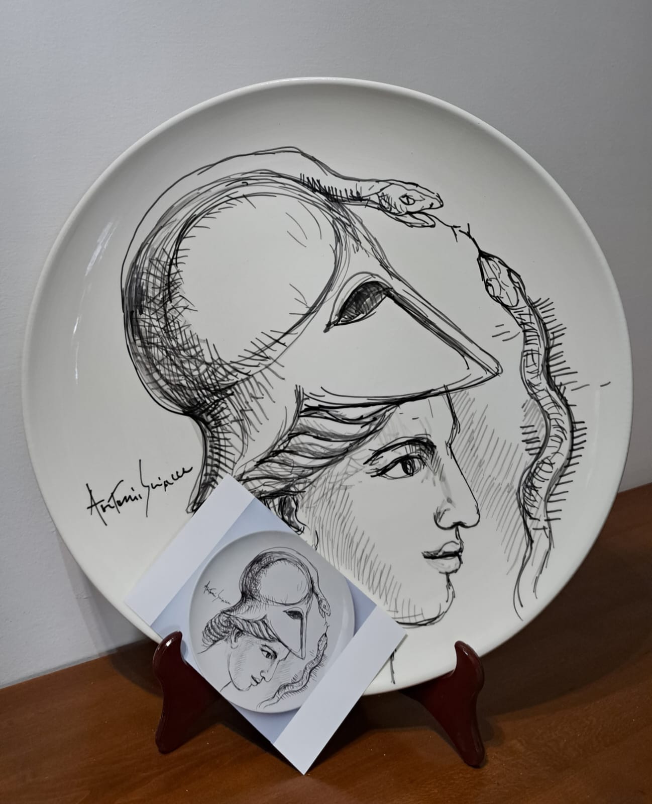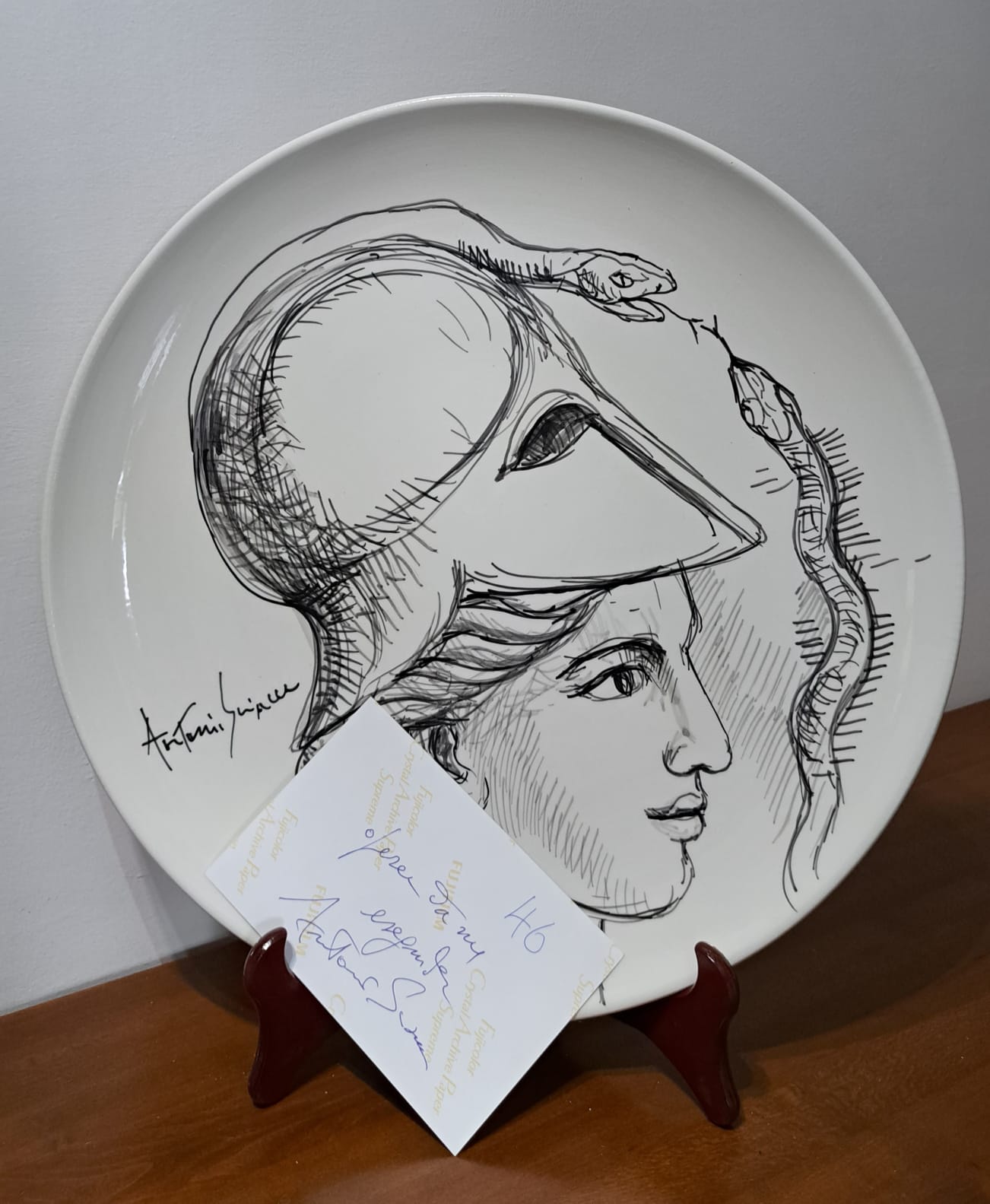 Anche il Maestro Antonio Sciacca ha l’opportunità di cimentarsi con questo antichissimo mezzo espressivo ed esplorare le possibilità che la ceramica offre. Dopo aver visitato diverse fabbriche di ceramica prima a Caltagirone e dopo a Deruta, ebbe l’idea di tracciare su fogli alcune idee con le quali si presentò da un artigiano ceramista deciso a trasformare le idee in prodotti. Questi lavori non sono casuali ma piuttosto il risultato di una riflessione e di una preparazione. In questo senso, il processo creativo è lo stesso seguito per i dipinti a partire dai disegni della variazione e della metamorfosi. Dipingere sulla ceramica non è come dipingere sul cavalletto: quando si dipinge su tela, su tavola, su carta, o comunque su di un supporto che è già pronto, si vedono i risultati in tempo reale. Con la ceramica funziona diversamente: i colori si vedono solo a cottura ultimata, pertanto il corretto bilanciamento della preparazione ( che appare di colore grigiastro ) , per Sciacca rappresenta anche una sorte di sfida. Lo stesso vale per la velocità con cui occorre portare a termine il lavoro perchè la ceramica come è noto ha proprietà assorbenti e per evitare che la preparazione asciughi troppo in fretta è necessario essere rapidi. Sciacca, per altro, sfrutta questa caratteristica a suo vantaggio, perchè in questo modo può conferire maggior tensione e dinamismo al soggetto raffigurato ( i suoi disegni sembrano quasi in movimento ). La ceramica è una delle forme d’arte più antiche che si conoscano: è una forma d’arte cosi antica e di cosi largo uso che Sciacca adatta anche per far arrivare l’arte contemporanea ad un pubblico più ambio.