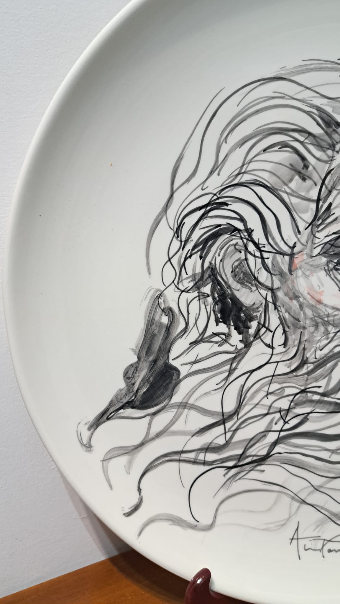 Anche il Maestro Antonio Sciacca ha l’opportunità di cimentarsi con questo antichissimo mezzo espressivo ed esplorare le possibilità che la ceramica offre. Dopo aver visitato diverse fabbriche di ceramica prima a Caltagirone e dopo a Deruta, ebbe l’idea di tracciare su fogli alcune idee con le quali si presentò da un artigiano ceramista deciso a trasformare le idee in prodotti. Questi lavori non sono casuali ma piuttosto il risultato di una riflessione e di una preparazione. In questo senso, il processo creativo è lo stesso seguito per i dipinti a partire dai disegni della variazione e della metamorfosi. Dipingere sulla ceramica non è come dipingere sul cavalletto: quando si dipinge su tela, su tavola, su carta, o comunque su di un supporto che è già pronto, si vedono i risultati in tempo reale. Con la ceramica funziona diversamente: i colori si vedono solo a cottura ultimata, pertanto il corretto bilanciamento della preparazione ( che appare di colore grigiastro ) , per Sciacca rappresenta anche una sorte di sfida. Lo stesso vale per la velocità con cui occorre portare a termine il lavoro perchè la ceramica come è noto ha proprietà assorbenti e per evitare che la preparazione asciughi troppo in fretta è necessario essere rapidi. Sciacca, per altro, sfrutta questa caratteristica a suo vantaggio, perchè in questo modo può conferire maggior tensione e dinamismo al soggetto raffigurato ( i suoi disegni sembrano quasi in movimento ). La ceramica è una delle forme d’arte più antiche che si conoscano: è una forma d’arte cosi antica e di cosi largo uso che Sciacca adatta anche per far arrivare l’arte contemporanea ad un pubblico più ambio.