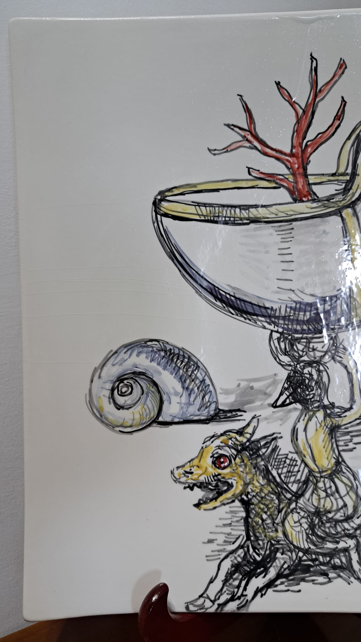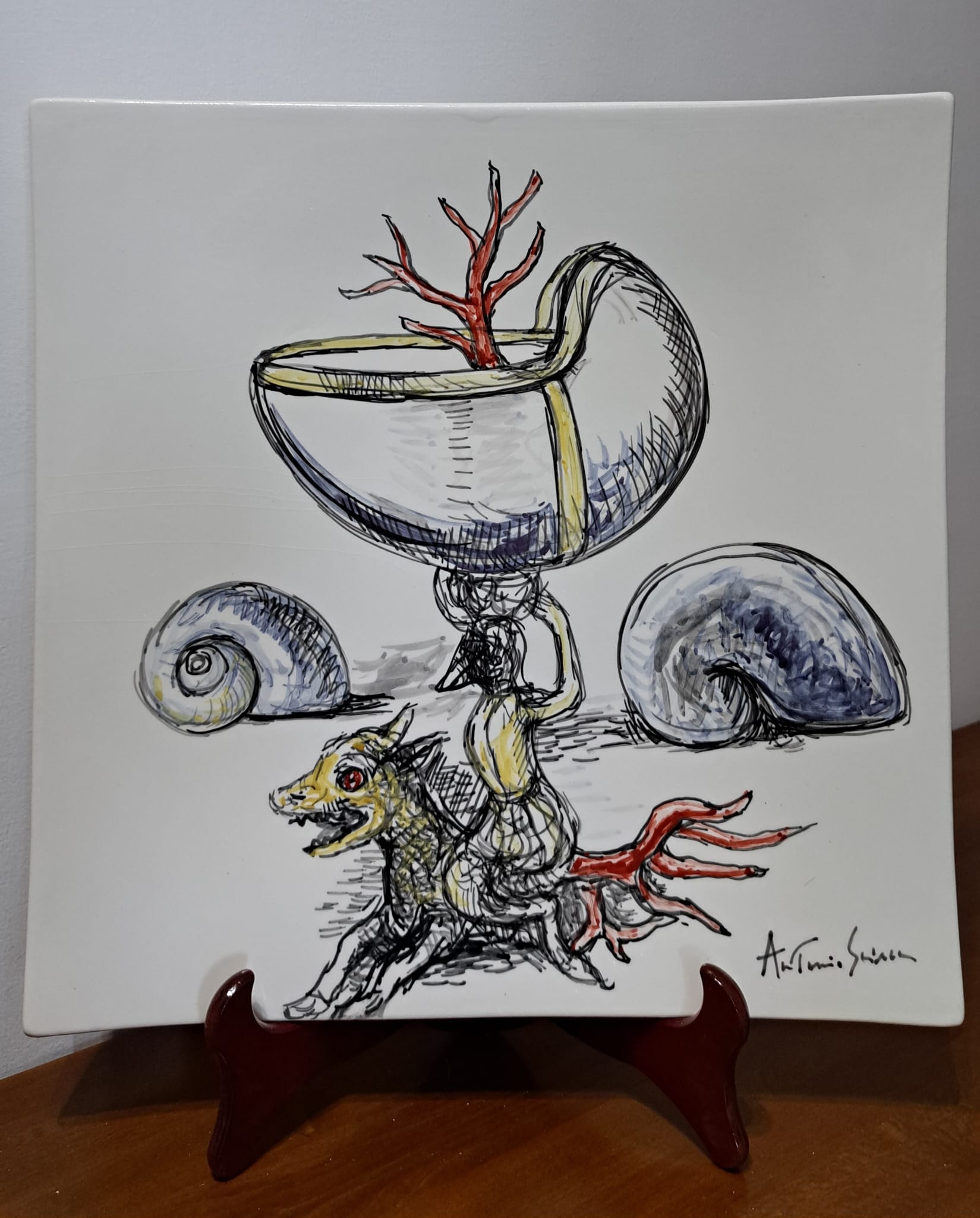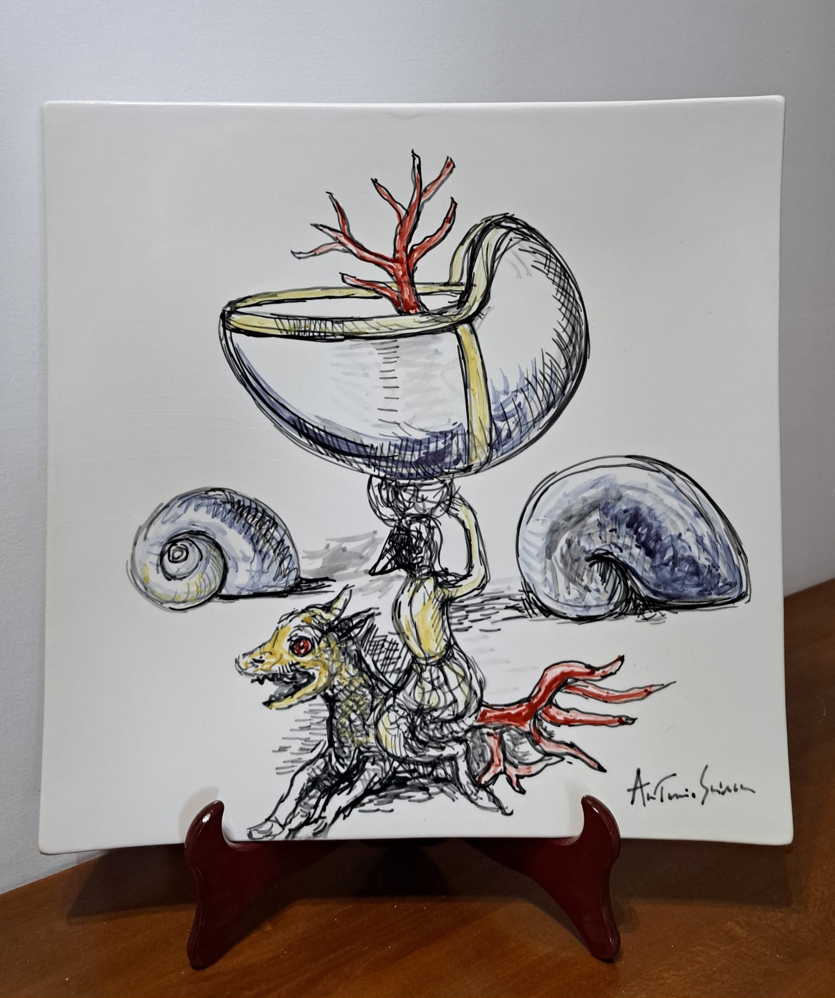 Anche il Maestro Antonio Sciacca ha l’opportunità di cimentarsi con questo antichissimo mezzo espressivo ed esplorare le possibilità che la ceramica offre. Dopo aver visitato diverse fabbriche di ceramica prima a Caltagirone e dopo a Deruta, ebbe l’idea di tracciare su fogli alcune idee con le quali si presentò da un artigiano ceramista deciso a trasformare le idee in prodotti. Questi lavori non sono casuali ma piuttosto il risultato di una riflessione e di una preparazione. In questo senso, il processo creativo è lo stesso seguito per i dipinti a partire dai disegni della variazione e della metamorfosi. Dipingere sulla ceramica non è come dipingere sul cavalletto: quando si dipinge su tela, su tavola, su carta, o comunque su di un supporto che è già pronto, si vedono i risultati in tempo reale. Con la ceramica funziona diversamente: i colori si vedono solo a cottura ultimata, pertanto il corretto bilanciamento della preparazione ( che appare di colore grigiastro ) , per Sciacca rappresenta anche una sorte di sfida. Lo stesso vale per la velocità con cui occorre portare a termine il lavoro perchè la ceramica come è noto ha proprietà assorbenti e per evitare che la preparazione asciughi troppo in fretta è necessario essere rapidi. Sciacca, per altro, sfrutta questa caratteristica a suo vantaggio, perchè  in questo modo può conferire maggior tensione e dinamismo al soggetto  raffigurato ( i suoi disegni sembrano quasi in movimento ). La ceramica è una delle forme d’arte più antiche che si conoscano: è una forma d’arte cosi antica e di cosi largo uso che Sciacca adatta anche per far arrivare l’arte contemporanea ad un pubblico più ambio.
