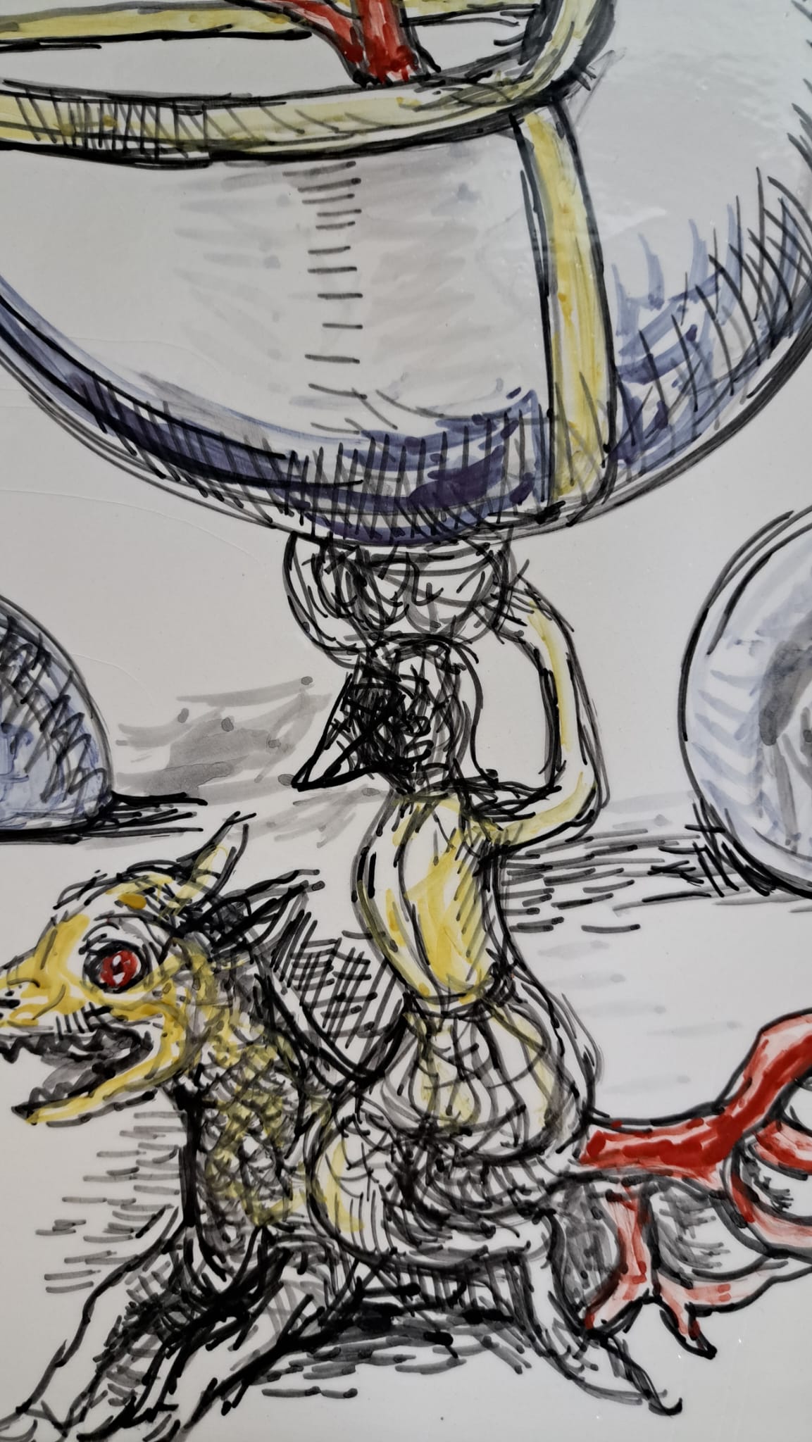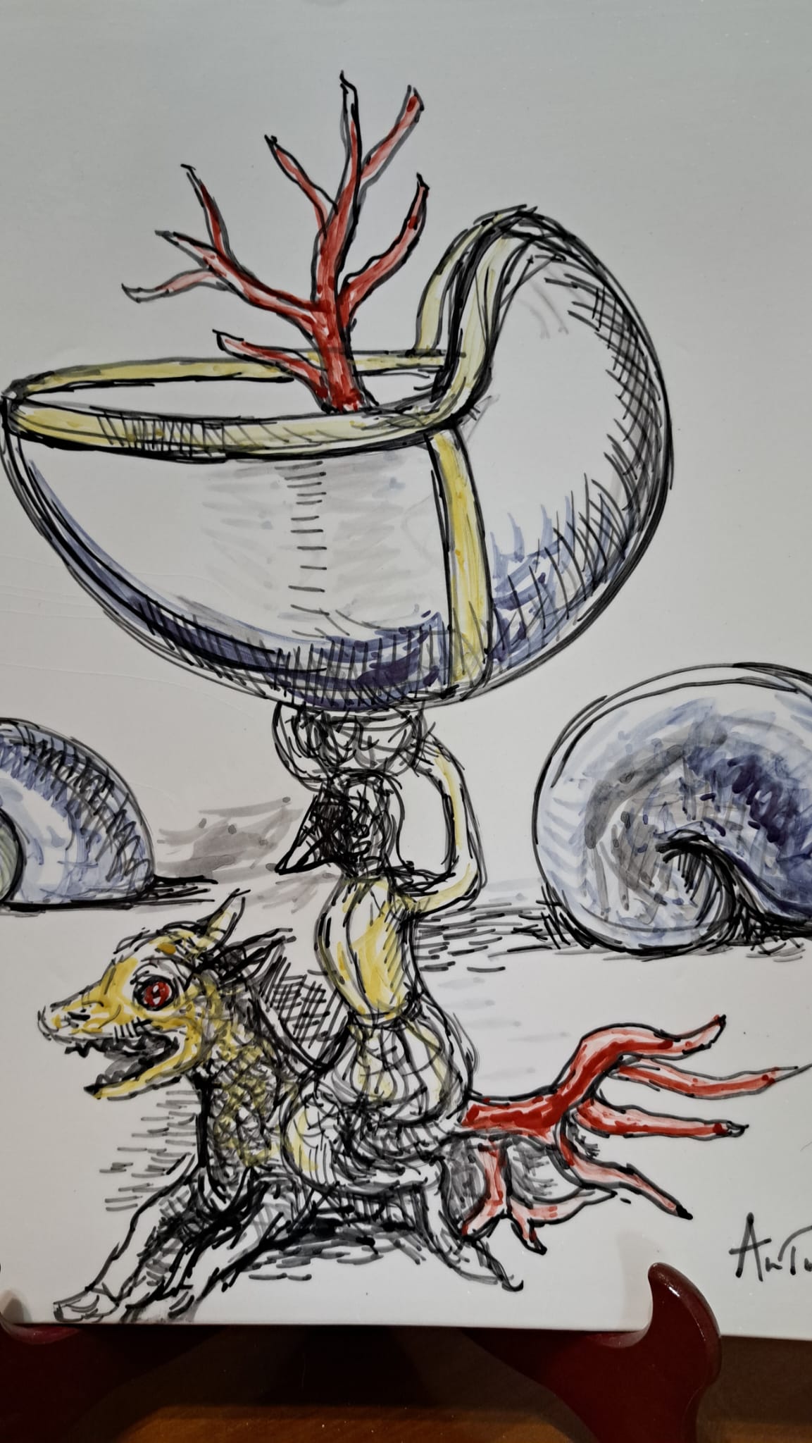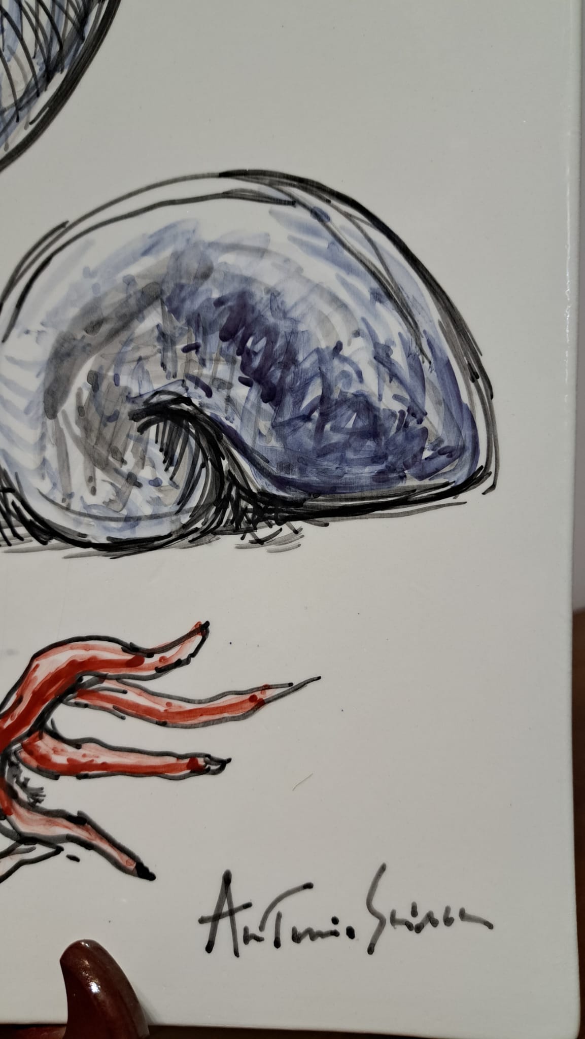 Anche il Maestro Antonio Sciacca ha l’opportunità di cimentarsi con questo antichissimo mezzo espressivo ed esplorare le possibilità che la ceramica offre. Dopo aver visitato diverse fabbriche di ceramica prima a Caltagirone e dopo a Deruta, ebbe l’idea di tracciare su fogli alcune idee con le quali si presentò da un artigiano ceramista deciso a trasformare le idee in prodotti. Questi lavori non sono casuali ma piuttosto il risultato di una riflessione e di una preparazione. In questo senso, il processo creativo è lo stesso seguito per i dipinti a partire dai disegni della variazione e della metamorfosi. Dipingere sulla ceramica non è come dipingere sul cavalletto: quando si dipinge su tela, su tavola, su carta, o comunque su di un supporto che è già pronto, si vedono i risultati in tempo reale. Con la ceramica funziona diversamente: i colori si vedono solo a cottura ultimata, pertanto il corretto bilanciamento della preparazione ( che appare di colore grigiastro ) , per Sciacca rappresenta anche una sorte di sfida. Lo stesso vale per la velocità con cui occorre portare a termine il lavoro perchè la ceramica come è noto ha proprietà assorbenti e per evitare che la preparazione asciughi troppo in fretta è necessario essere rapidi. Sciacca, per altro, sfrutta questa caratteristica a suo vantaggio, perchè  in questo modo può conferire maggior tensione e dinamismo al soggetto  raffigurato ( i suoi disegni sembrano quasi in movimento ). La ceramica è una delle forme d’arte più antiche che si conoscano: è una forma d’arte cosi antica e di cosi largo uso che Sciacca adatta anche per far arrivare l’arte contemporanea ad un pubblico più ambio.
