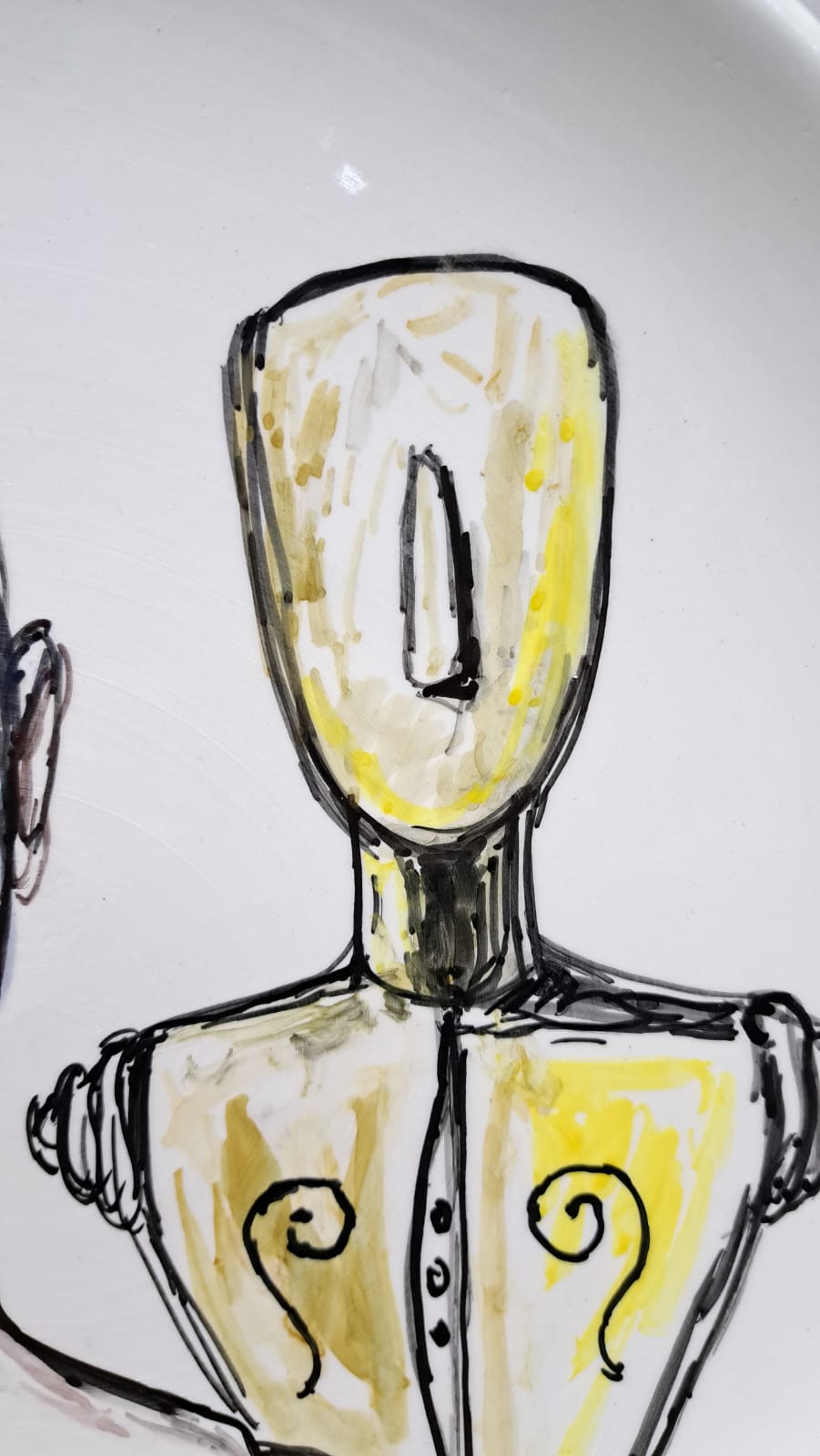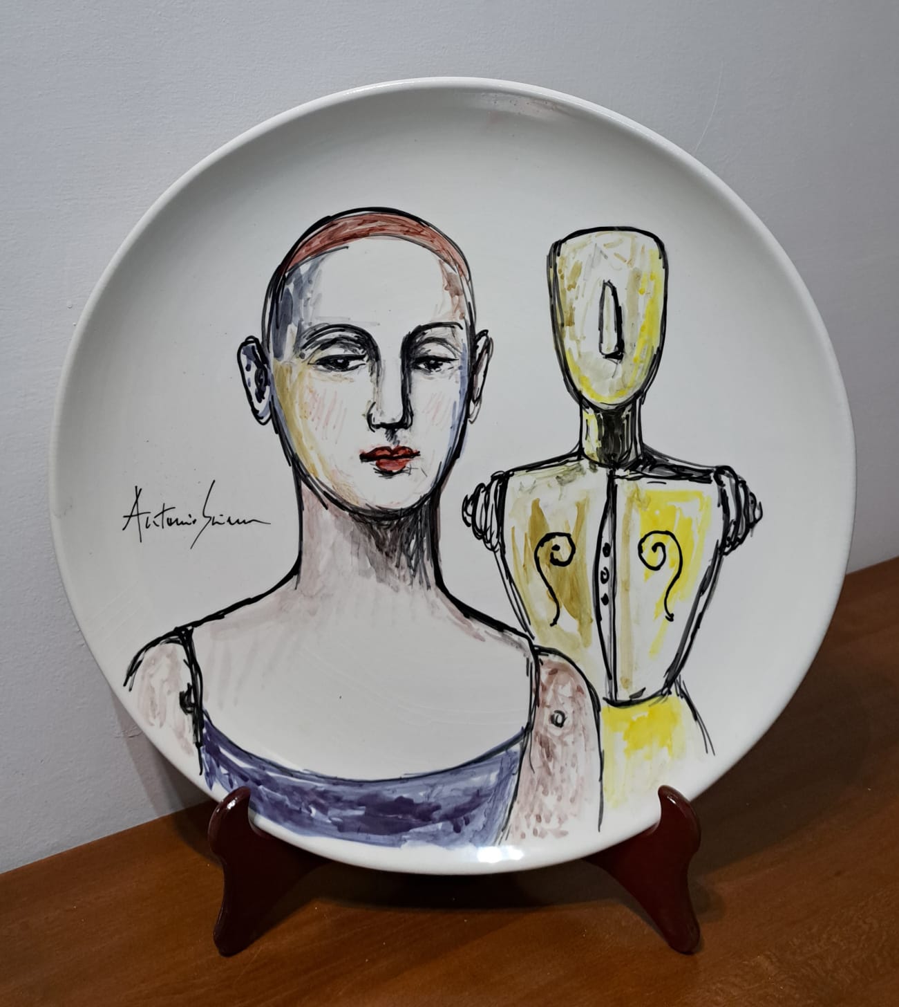 Anche il Maestro Antonio Sciacca ha l’opportunità di cimentarsi con questo antichissimo mezzo espressivo ed esplorare le possibilità che la ceramica offre. Dopo aver visitato diverse fabbriche di ceramica prima a Caltagirone e dopo a Deruta, ebbe l’idea di tracciare su fogli alcune idee con le quali si presentò da un artigiano ceramista deciso a trasformare le idee in prodotti. Questi lavori non sono casuali ma piuttosto il risultato di una riflessione e di una preparazione. In questo senso, il processo creativo è lo stesso seguito per i dipinti a partire dai disegni della variazione e della metamorfosi. Dipingere sulla ceramica non è come dipingere sul cavalletto: quando si dipinge su tela, su tavola, su carta, o comunque su di un supporto che è già pronto, si vedono i risultati in tempo reale. Con la ceramica funziona diversamente: i colori si vedono solo a cottura ultimata, pertanto il corretto bilanciamento della preparazione ( che appare di colore grigiastro ) , per Sciacca rappresenta anche una sorte di sfida. Lo stesso vale per la velocità con cui occorre portare a termine il lavoro perchè la ceramica come è noto ha proprietà assorbenti e per evitare che la preparazione asciughi troppo in fretta è necessario essere rapidi. Sciacca, per altro, sfrutta questa caratteristica a suo vantaggio, perchè in questo modo può conferire maggior tensione e dinamismo al soggetto raffigurato ( i suoi disegni sembrano quasi in movimento ). La ceramica è una delle forme d’arte più antiche che si conoscano: è una forma d’arte cosi antica e di cosi largo uso che Sciacca adatta anche per far arrivare l’arte contemporanea ad un pubblico più ambio.