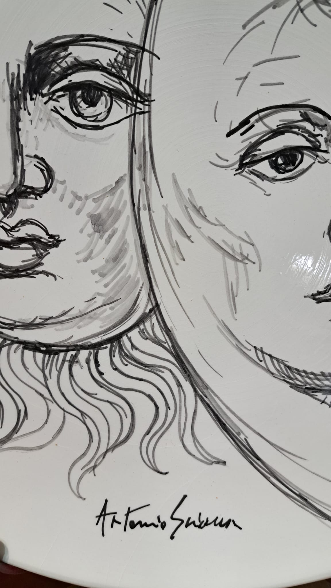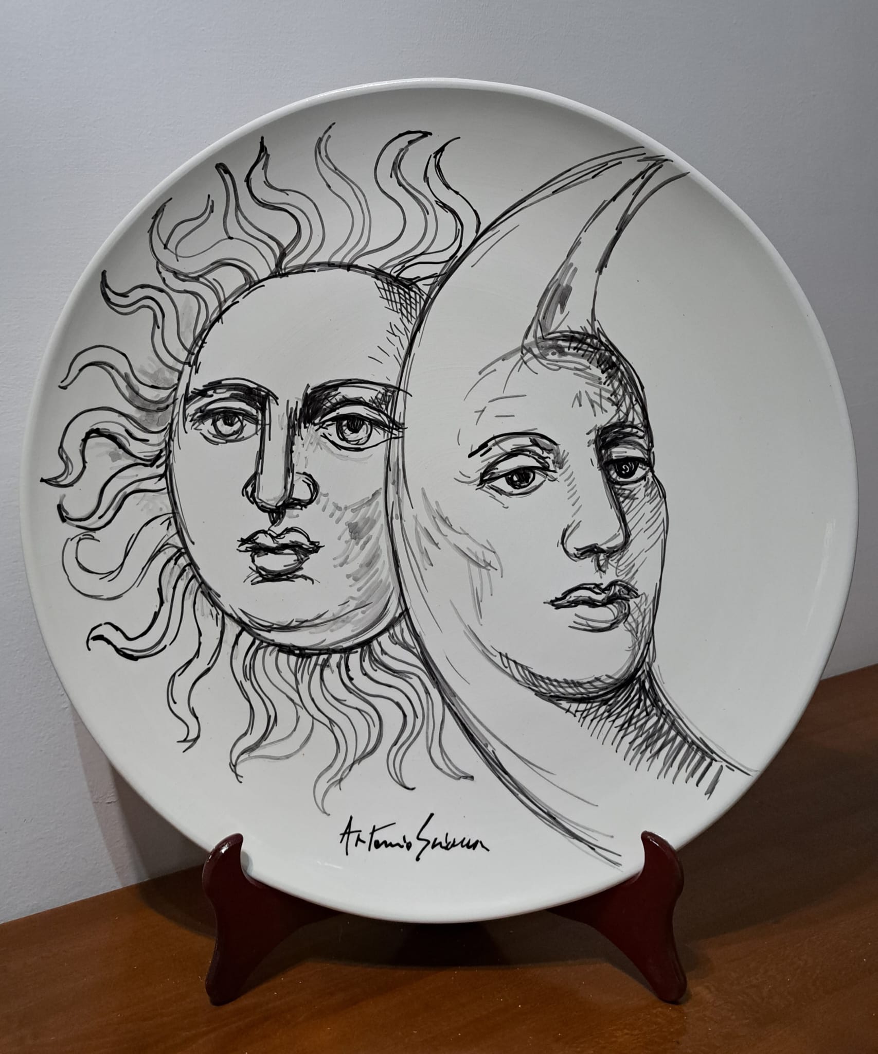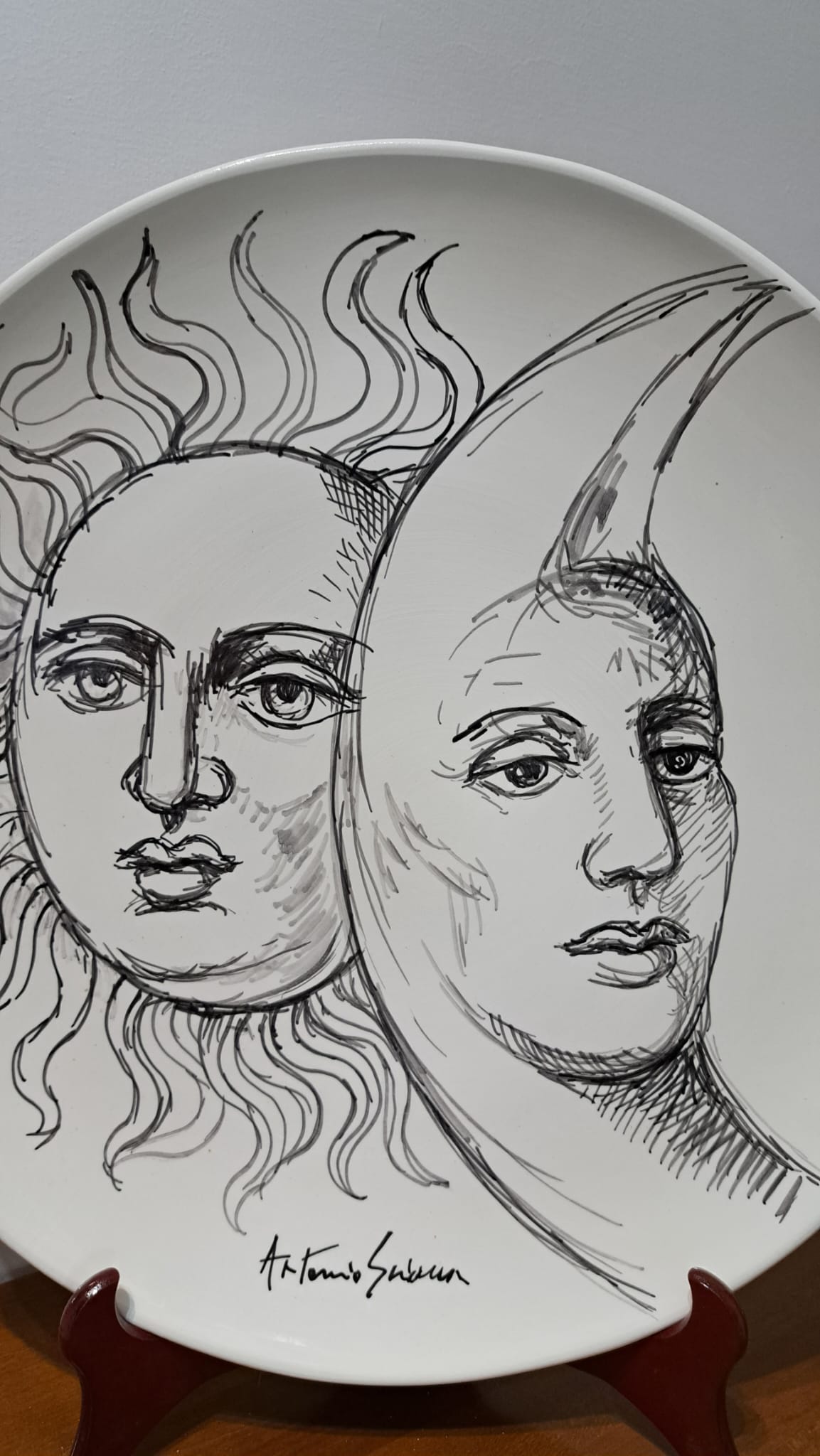 Anche il Maestro Antonio Sciacca ha l’opportunità di cimentarsi con questo antichissimo mezzo espressivo ed esplorare le possibilità che la ceramica offre. Dopo aver visitato diverse fabbriche di ceramica prima a Caltagirone e dopo a Deruta, ebbe l’idea di tracciare su fogli alcune idee con le quali si presentò da un artigiano ceramista deciso a trasformare le idee in prodotti. Questi lavori non sono casuali ma piuttosto il risultato di una riflessione e di una preparazione. In questo senso, il processo creativo è lo stesso seguito per i dipinti a partire dai disegni della variazione e della metamorfosi. Dipingere sulla ceramica non è come dipingere sul cavalletto: quando si dipinge su tela, su tavola, su carta, o comunque su di un supporto che è già pronto, si vedono i risultati in tempo reale. Con la ceramica funziona diversamente: i colori si vedono solo a cottura ultimata, pertanto il corretto bilanciamento della preparazione ( che appare di colore grigiastro ) , per Sciacca rappresenta anche una sorte di sfida. Lo stesso vale per la velocità con cui occorre portare a termine il lavoro perchè la ceramica come è noto ha proprietà assorbenti e per evitare che la preparazione asciughi troppo in fretta è necessario essere rapidi. Sciacca, per altro, sfrutta questa caratteristica a suo vantaggio, perchè in questo modo può conferire maggior tensione e dinamismo al soggetto raffigurato ( i suoi disegni sembrano quasi in movimento ). La ceramica è una delle forme d’arte più antiche che si conoscano: è una forma d’arte cosi antica e di cosi largo uso che Sciacca adatta anche per far arrivare l’arte contemporanea ad un pubblico più ambio.