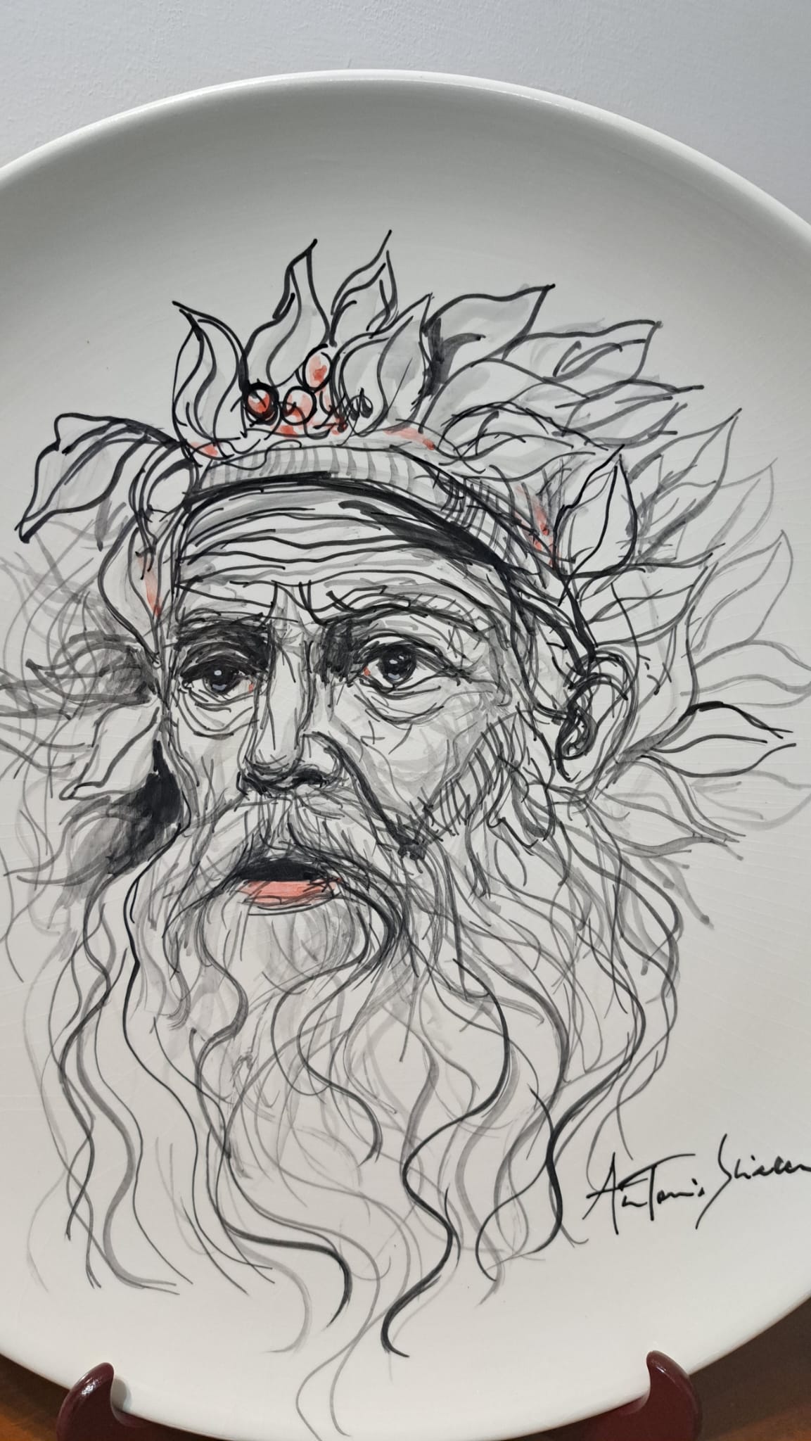 Anche il Maestro Antonio Sciacca ha l’opportunità di cimentarsi con questo antichissimo mezzo espressivo ed esplorare le possibilità che la ceramica offre. Dopo aver visitato diverse fabbriche di ceramica prima a Caltagirone e dopo a Deruta, ebbe l’idea di tracciare su fogli alcune idee con le quali si presentò da un artigiano ceramista deciso a trasformare le idee in prodotti. Questi lavori non sono casuali ma piuttosto il risultato di una riflessione e di una preparazione. In questo senso, il processo creativo è lo stesso seguito per i dipinti a partire dai disegni della variazione e della metamorfosi. Dipingere sulla ceramica non è come dipingere sul cavalletto: quando si dipinge su tela, su tavola, su carta, o comunque su di un supporto che è già pronto, si vedono i risultati in tempo reale. Con la ceramica funziona diversamente: i colori si vedono solo a cottura ultimata, pertanto il corretto bilanciamento della preparazione ( che appare di colore grigiastro ) , per Sciacca rappresenta anche una sorte di sfida. Lo stesso vale per la velocità con cui occorre portare a termine il lavoro perchè la ceramica come è noto ha proprietà assorbenti e per evitare che la preparazione asciughi troppo in fretta è necessario essere rapidi. Sciacca, per altro, sfrutta questa caratteristica a suo vantaggio, perchè  in questo modo può conferire maggior tensione e dinamismo al soggetto  raffigurato ( i suoi disegni sembrano quasi in movimento ). La ceramica è una delle forme d’arte più antiche che si conoscano: è una forma d’arte cosi antica e di cosi largo uso che Sciacca adatta anche per far arrivare l’arte contemporanea ad un pubblico più ambio.