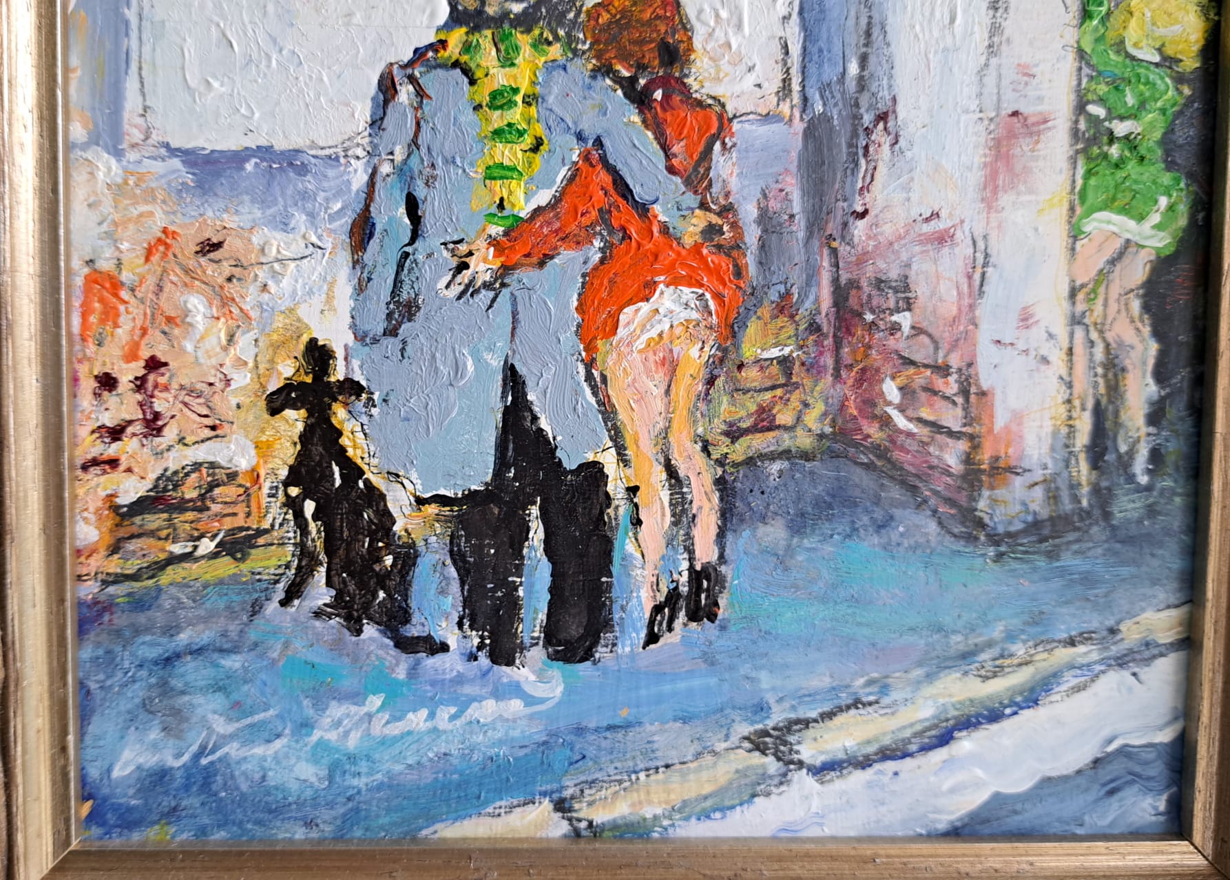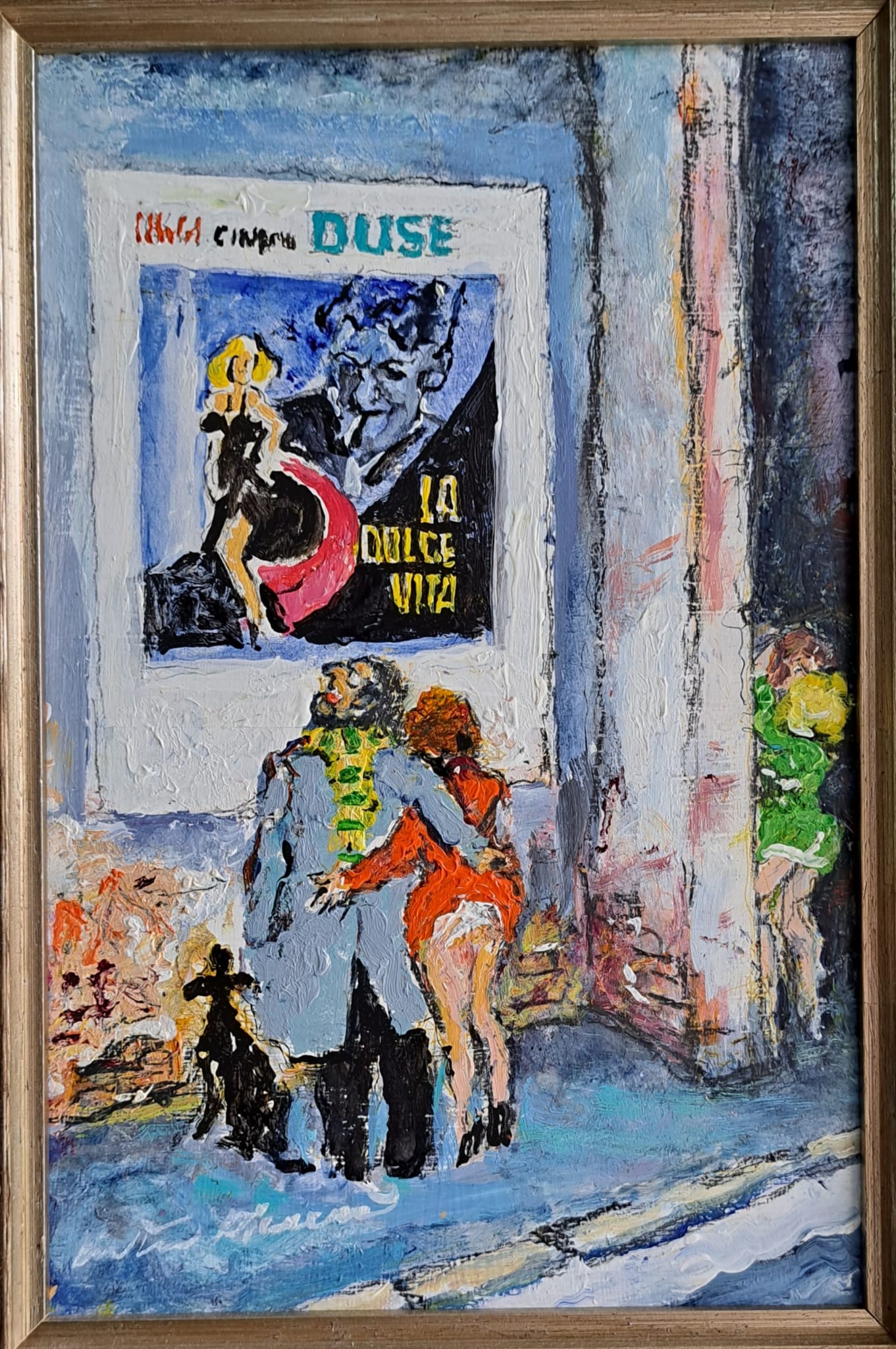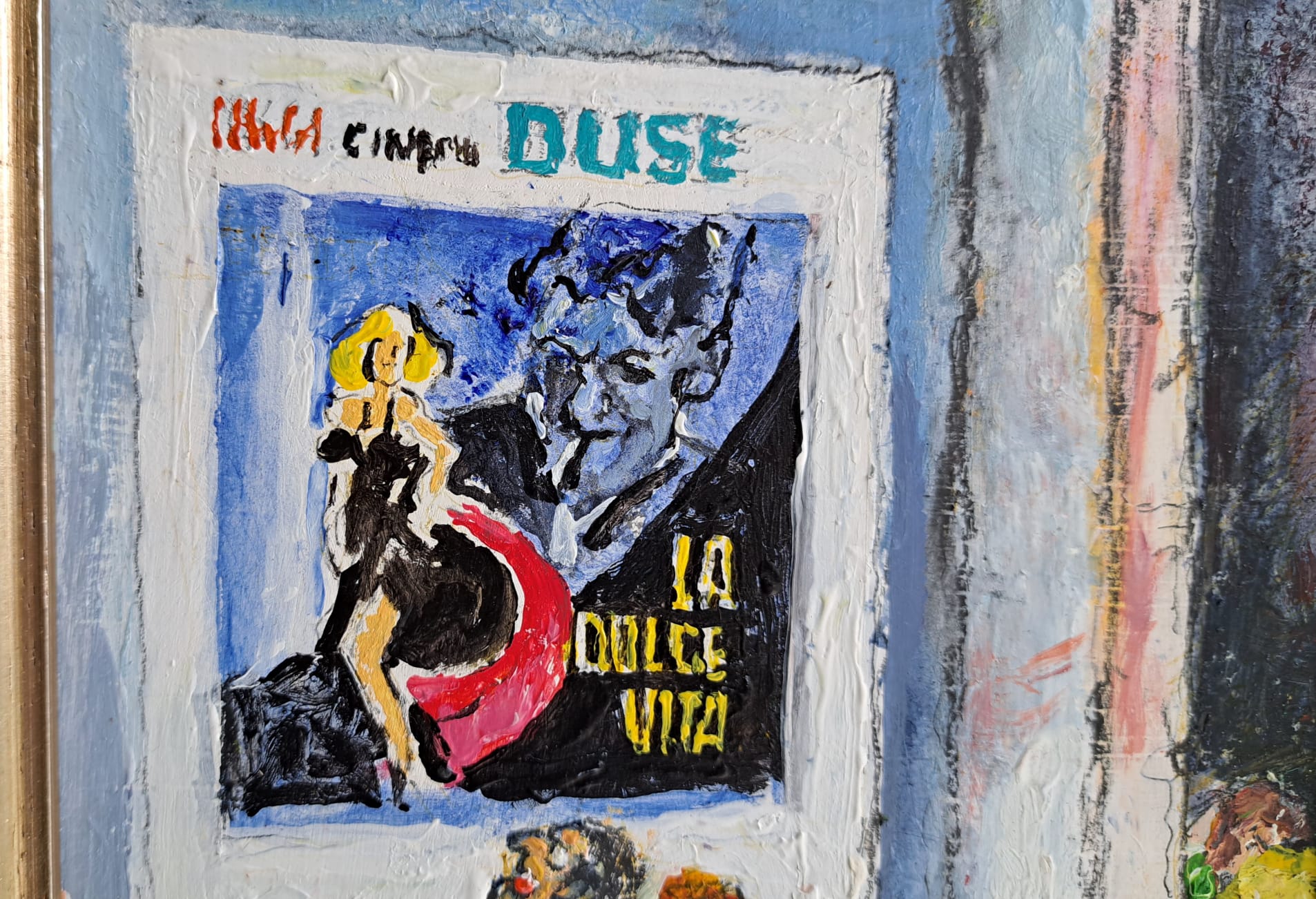 Opera unica di Walter Piacesi olio su tavola misura 20×30 cm titolo ” Pubblicità ” completa di autentica e archivio ufficiale CA’ SPINELLO
