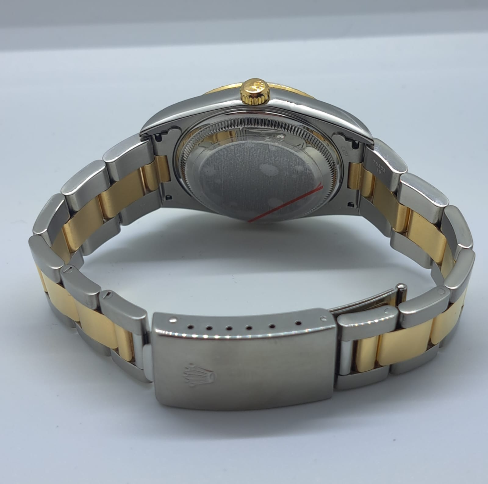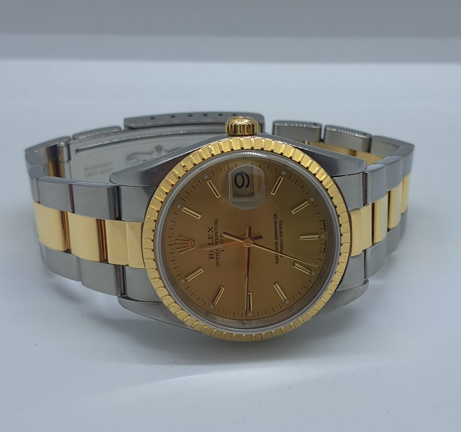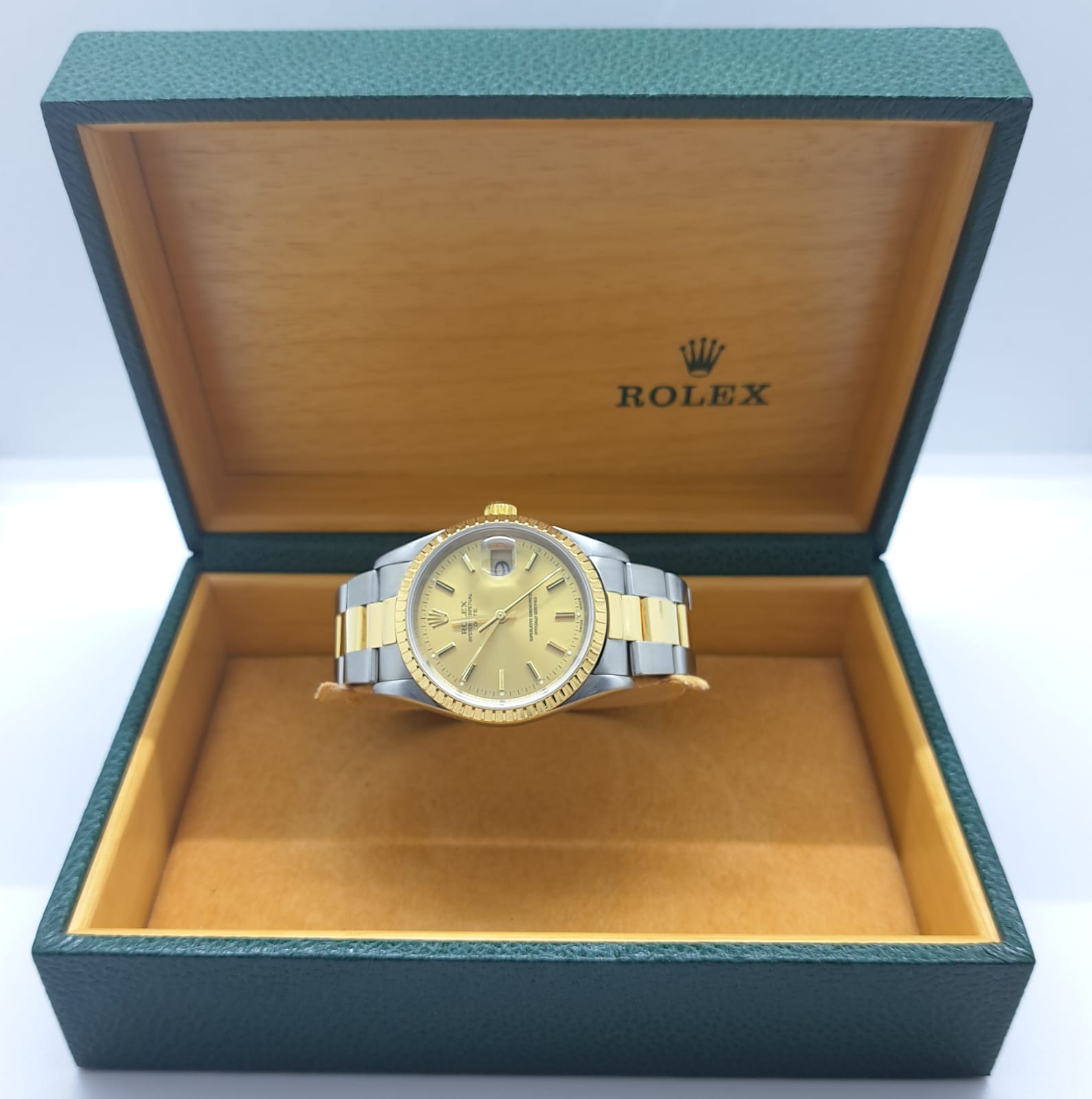 Questo Rolex 15223 è stato conservato in modo maniacale e si presenta in condizioni pari al nuovo, senza segni evidenti di usura su cassa, vetro o bracciale. Il quadrante champagne è luminoso e privo di imperfezioni, mentre il movimento è stato recentemente revisionato ed è perfettamente funzionante.