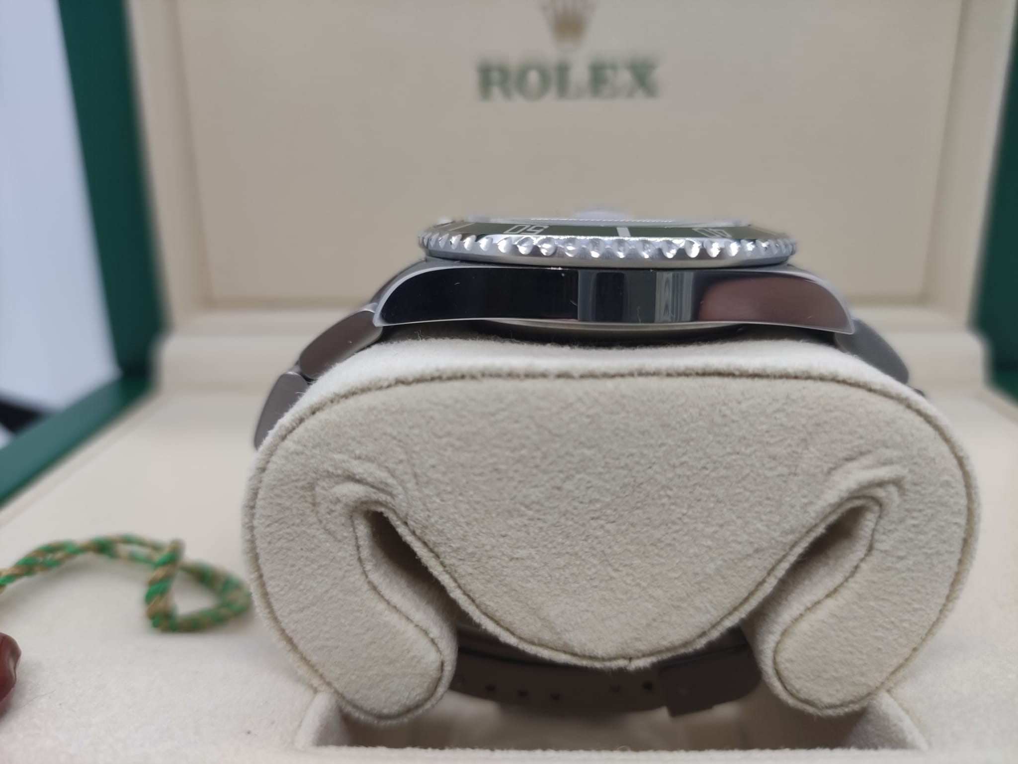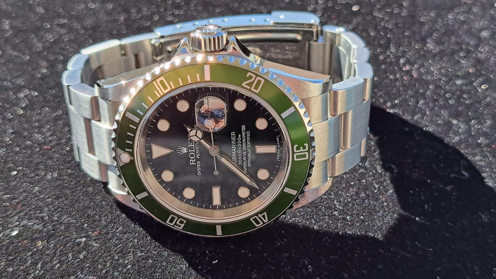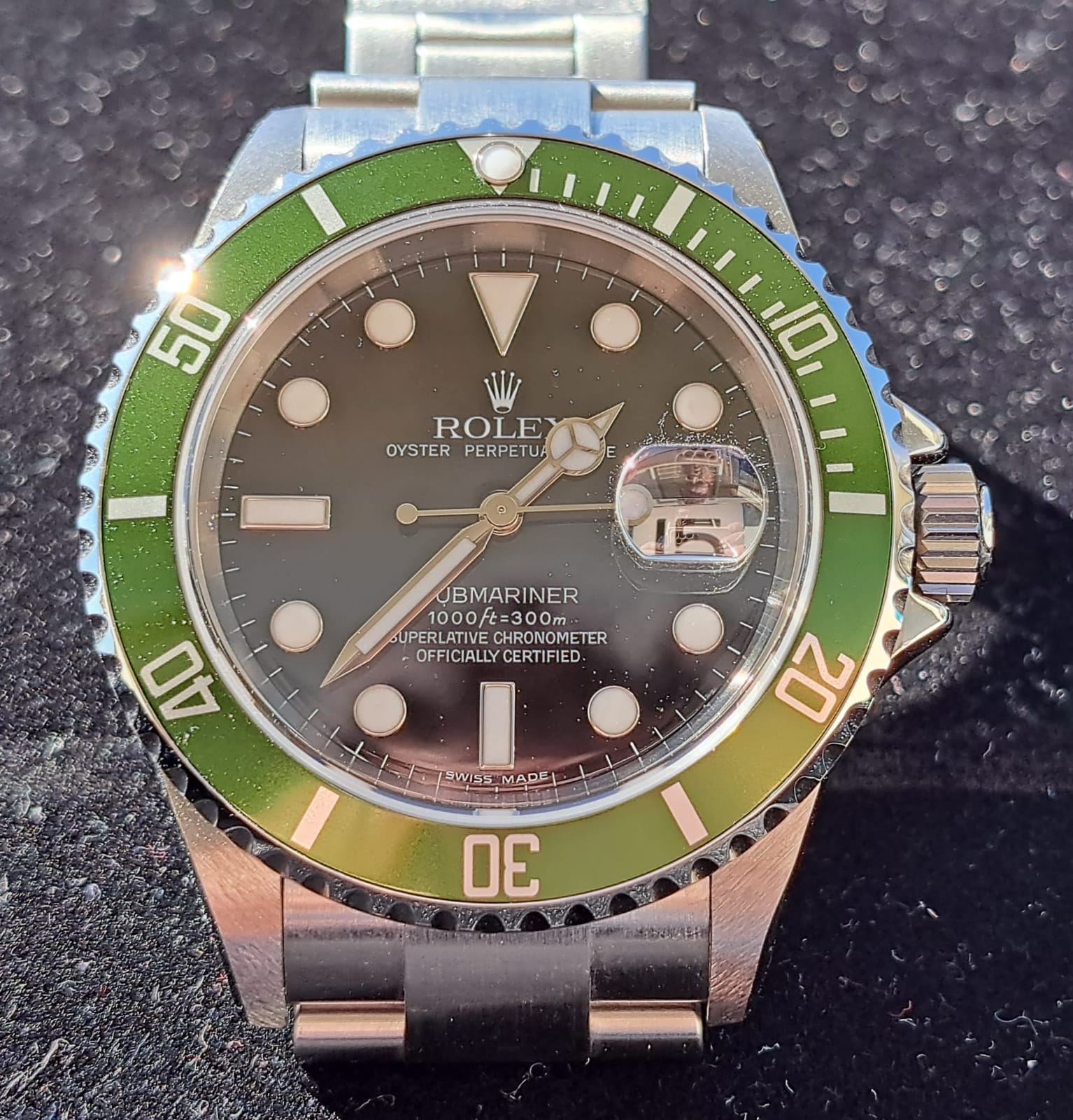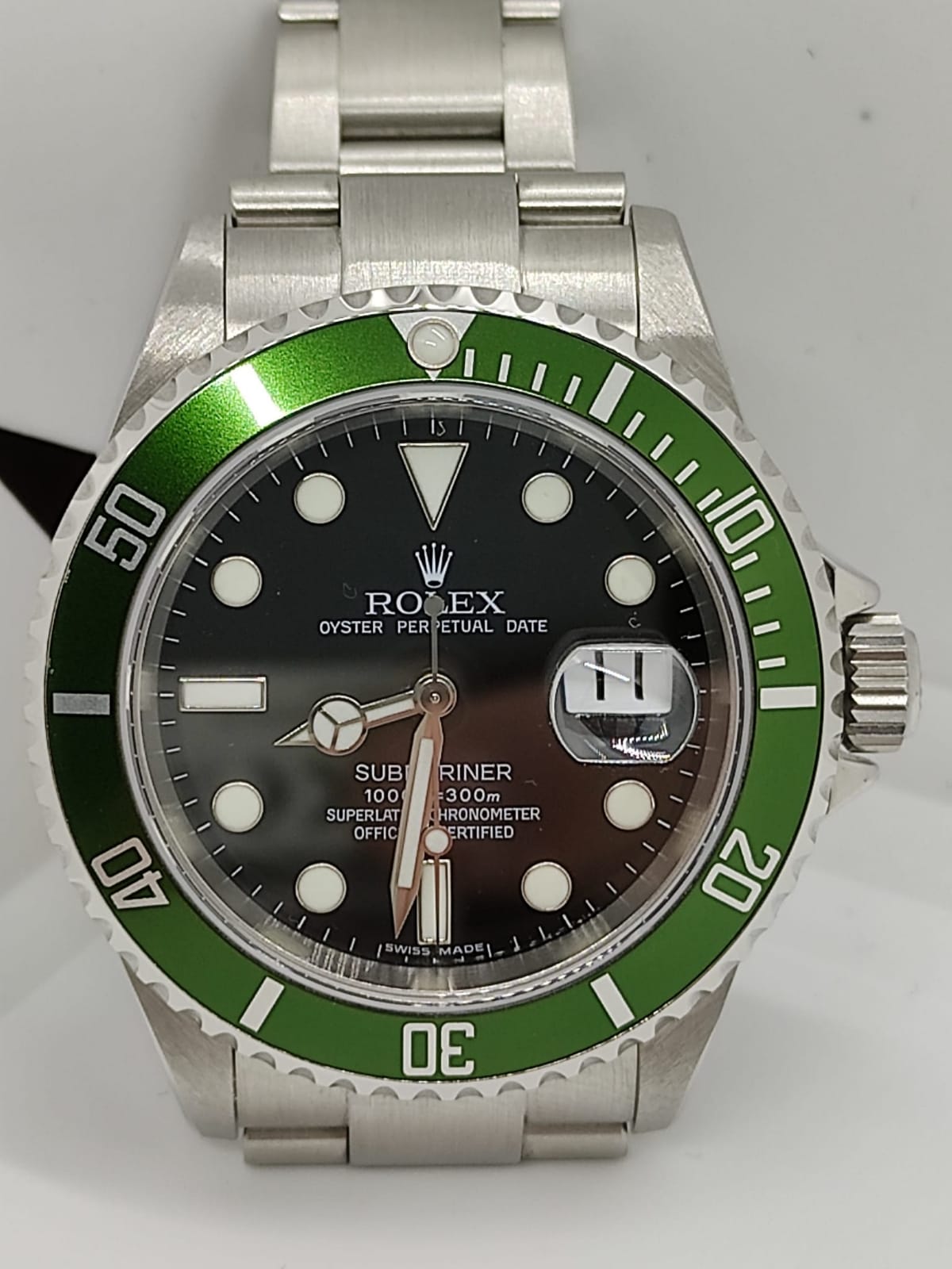 Rolex Submariner Ghiera Verde. Ormai diventato uno dei modelli più ambiti dai collezionisti del marchio e non solo. Versione nata per celebrare i 50 anni del Rolex Submariner, che dal 1953 (anno della sua nascita) è rimasto uno dei modelli più rappresentativi della Maison. Orologio con cassa Oyster in acciaio da 40 mm impermeabile fino a 300 metri. Inserto ghiera in alluminio di colore verde (segno distintivo del modello) che ha reso l’orologio noto tra i collezionisti con il soprannome di “kermit”, la famosa ranocchia del Muppet Show. Quadrante nero con datario a ore 3. Indici a bicchierini e sfere Mercedes. Bracciale Oyster 93250 con finali Solid End Links (SEL) e chiusira a scatoletta Rolex con chiusura di sicurezza aggiuntiva. Orologio FULL-SET completo di scatola libretti, TAG e garanzia ufficiali Rolex, corredo perfetto per collezionisti e appassionati.