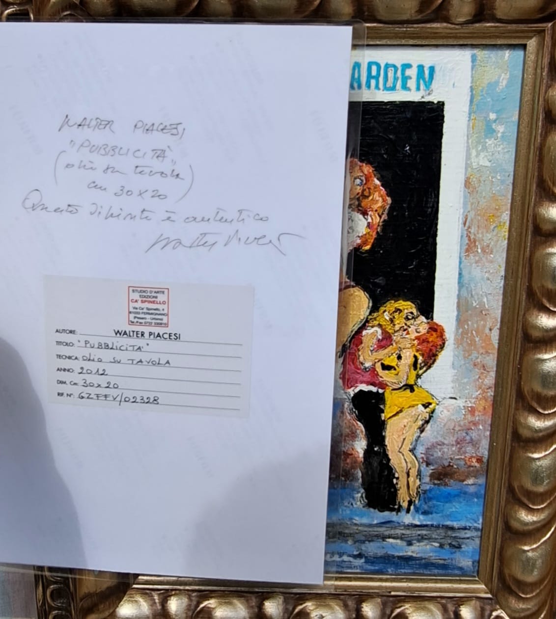 Opera unica di Walter Piacesi olio su tavola misura 20×30 cm titolo ” Pubblicità ” completa di autentica e archivio ufficiale CA’ SPINELLO