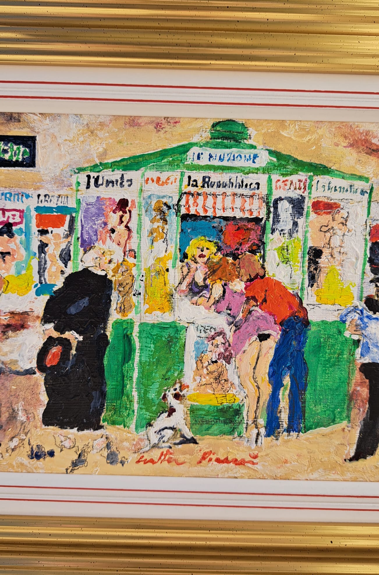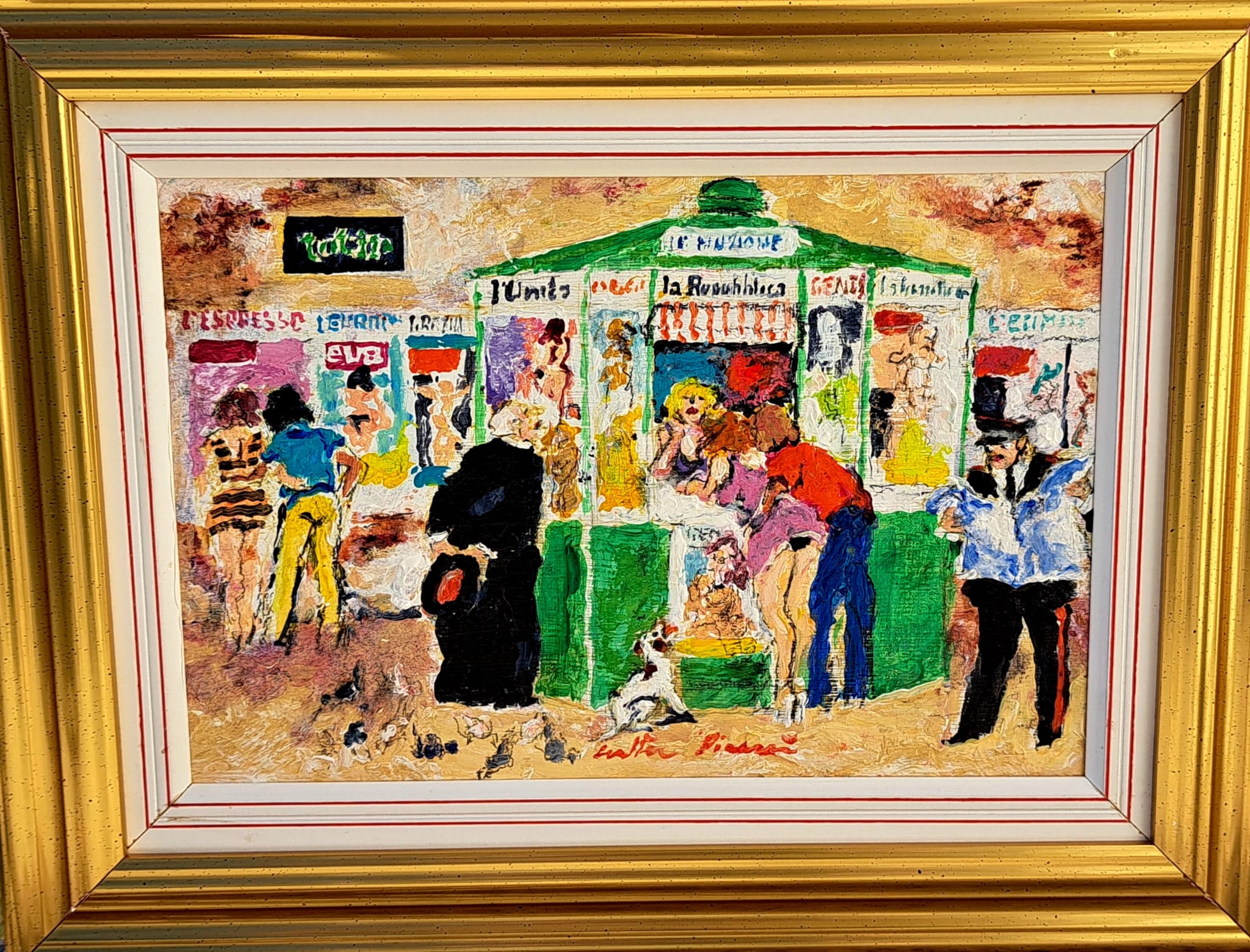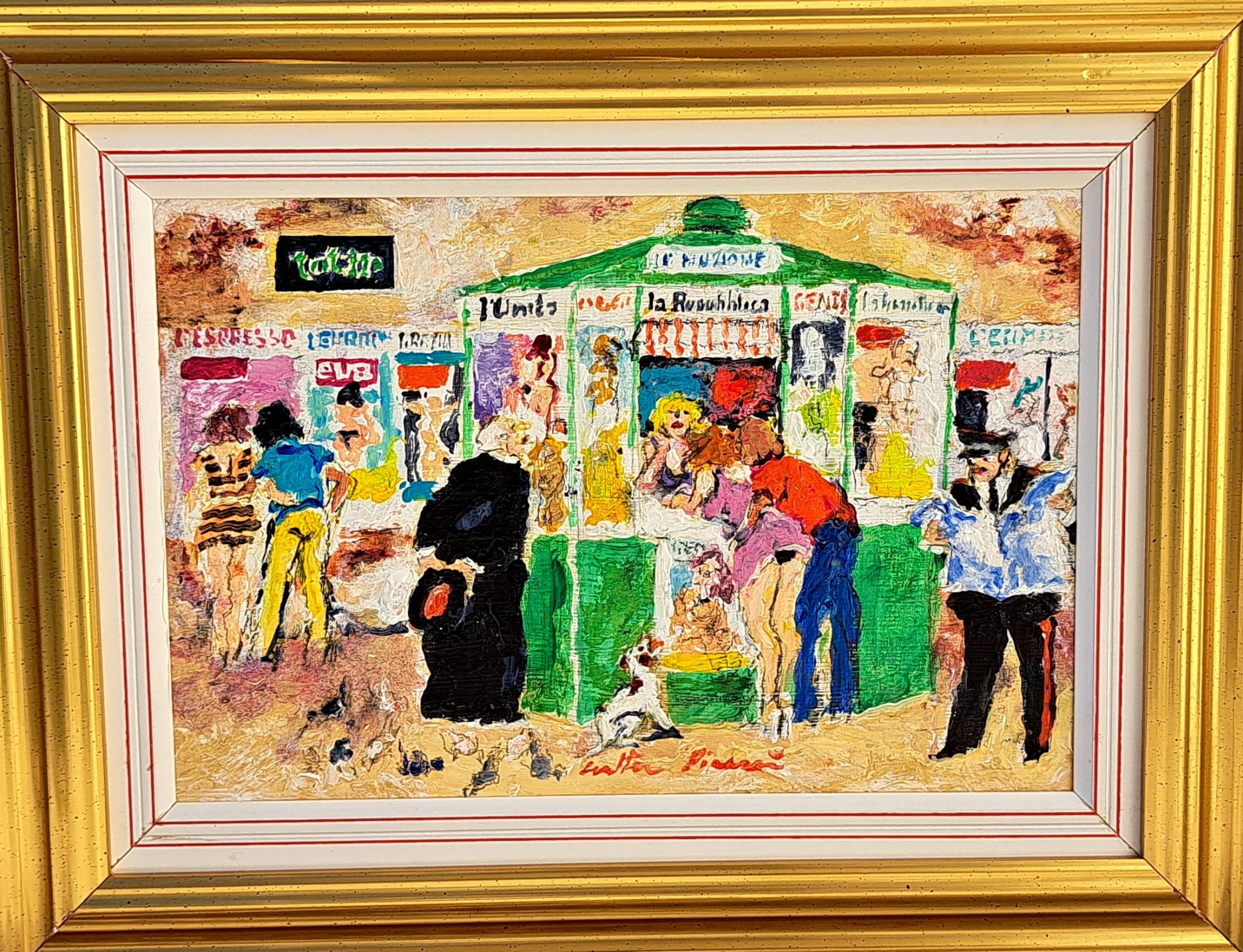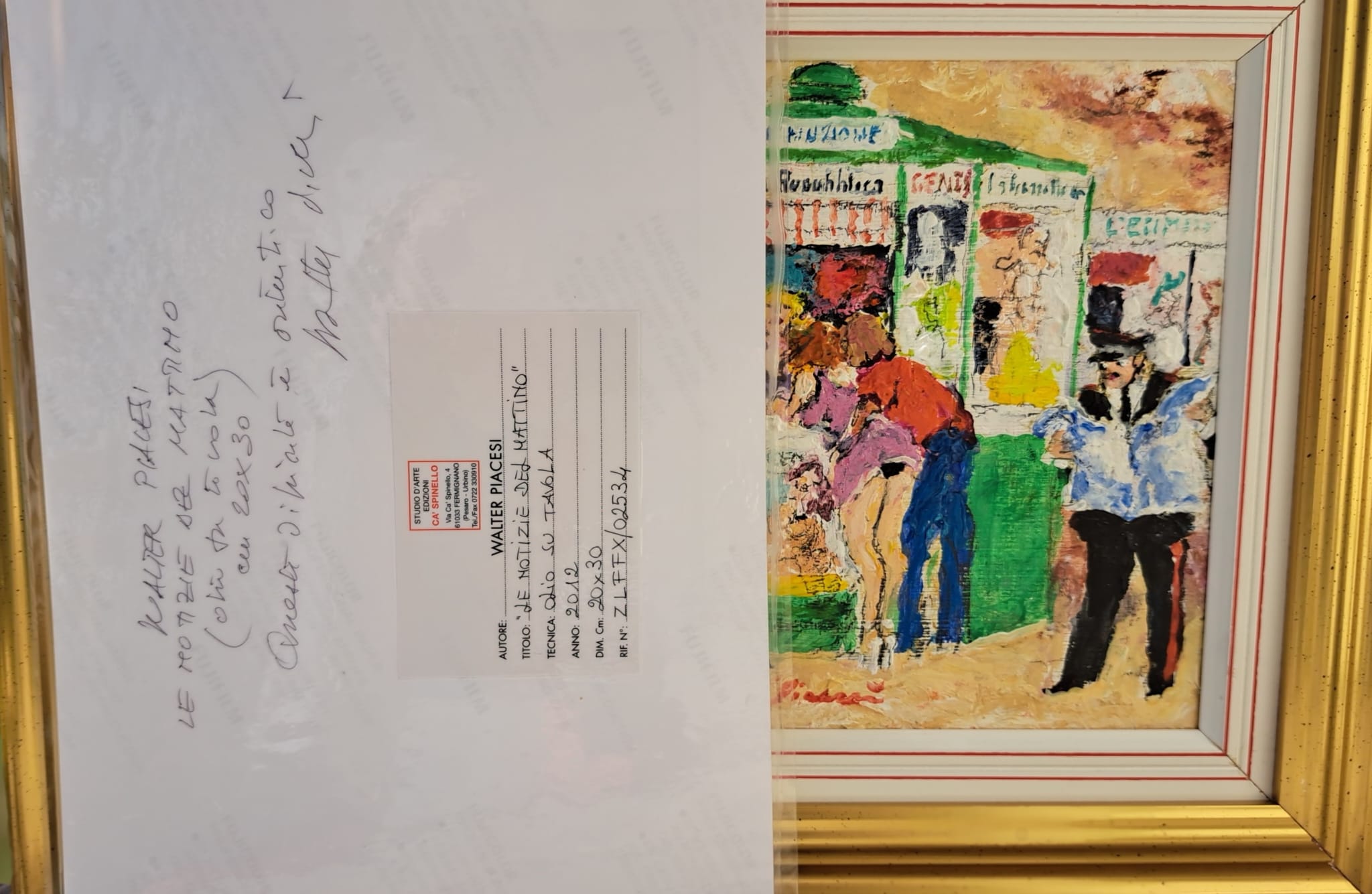 Opera unica di Walter Piacesi olio su tavola misura 20×30 cm titolo ” Le notizie del mattino ” completa di autentica e archivio ufficiale  CA’ SPINELLO